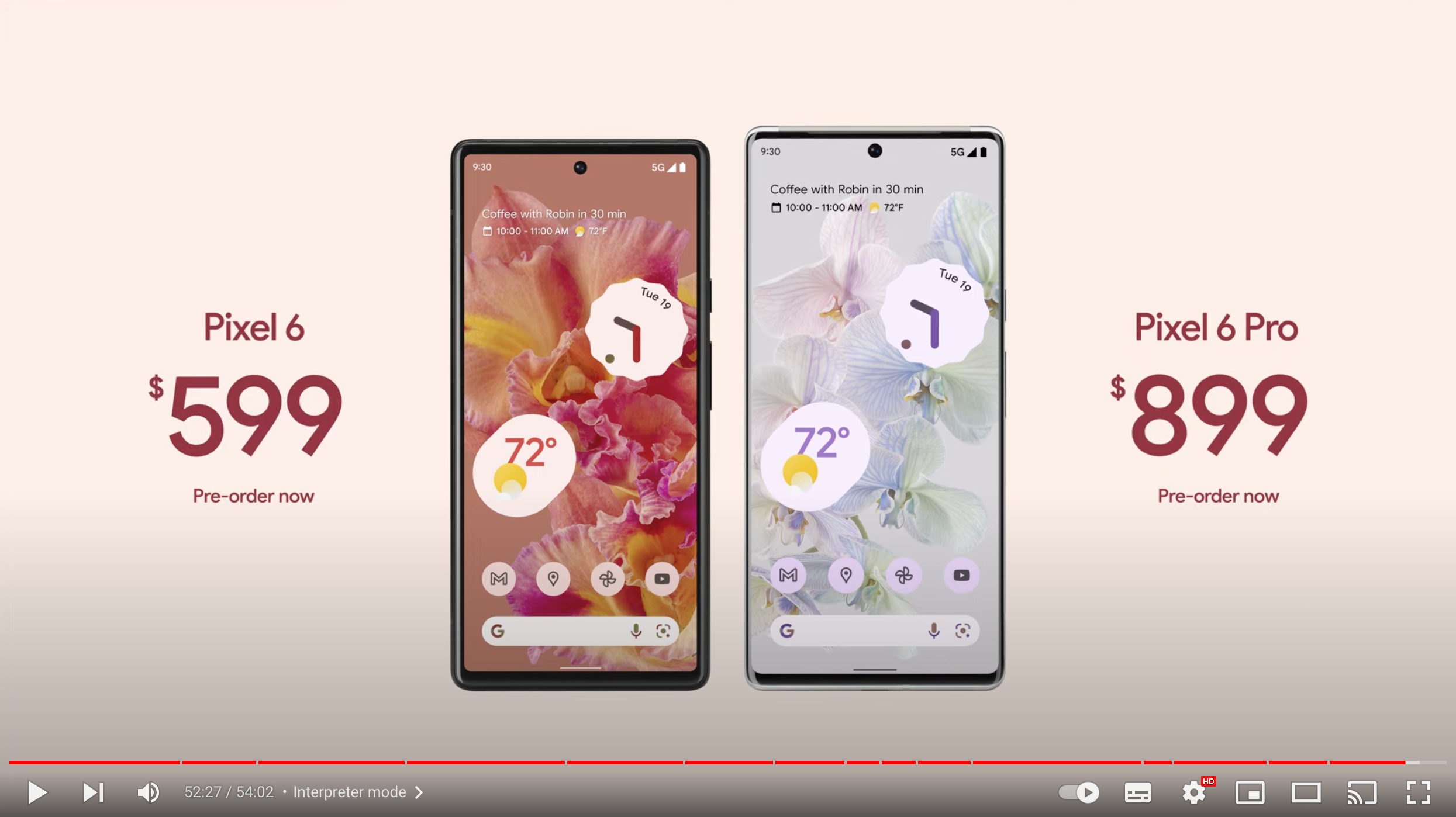 디바이스는 기본형 모델인 "Google Pixel 6($599)"와 고급형 모델인 "Google Pixel 6 Pro($899)"로 나누어 출시되는데, 둘다 구글의 핵심 코어인 "Google Tensor"를 탑재하였고 특히 Pro는 광학 4배 줌 지원, 4K UHD 비디오 촬영 가능한 전면 카메라, 10-120Hz 주사율을 지원하는 디스플레이 등 다양한 기능들이 지원된다고 한다.
