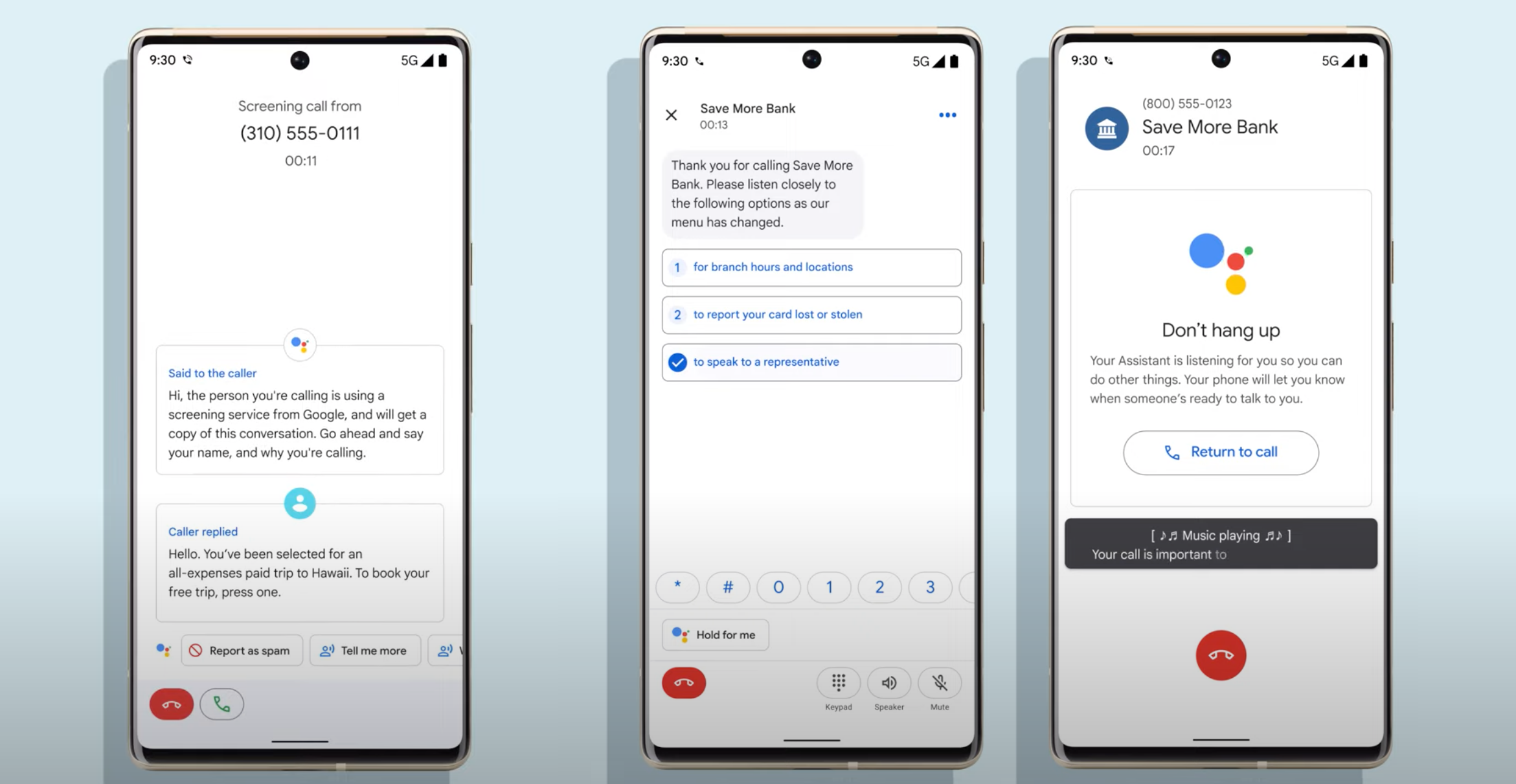 또다른 기능으로는 "통화"에서 활용될 수 있는 기능들이었는데 '스팸전화'가 왔을 때 내용을 글로 알려주거나(왼쪽), 복잡하고 대기를 많이 해야 하는 ARS 콜센터 전화도 인식된 내용을 화면에 보여주거나 음악이 나오는 대기시간을 AI가 대신 기다려주는 등 정말 필요한 기능들을 구글의 뛰어난 음성인식 기능을 통해 잘 풀어낸 것으로 보였다.