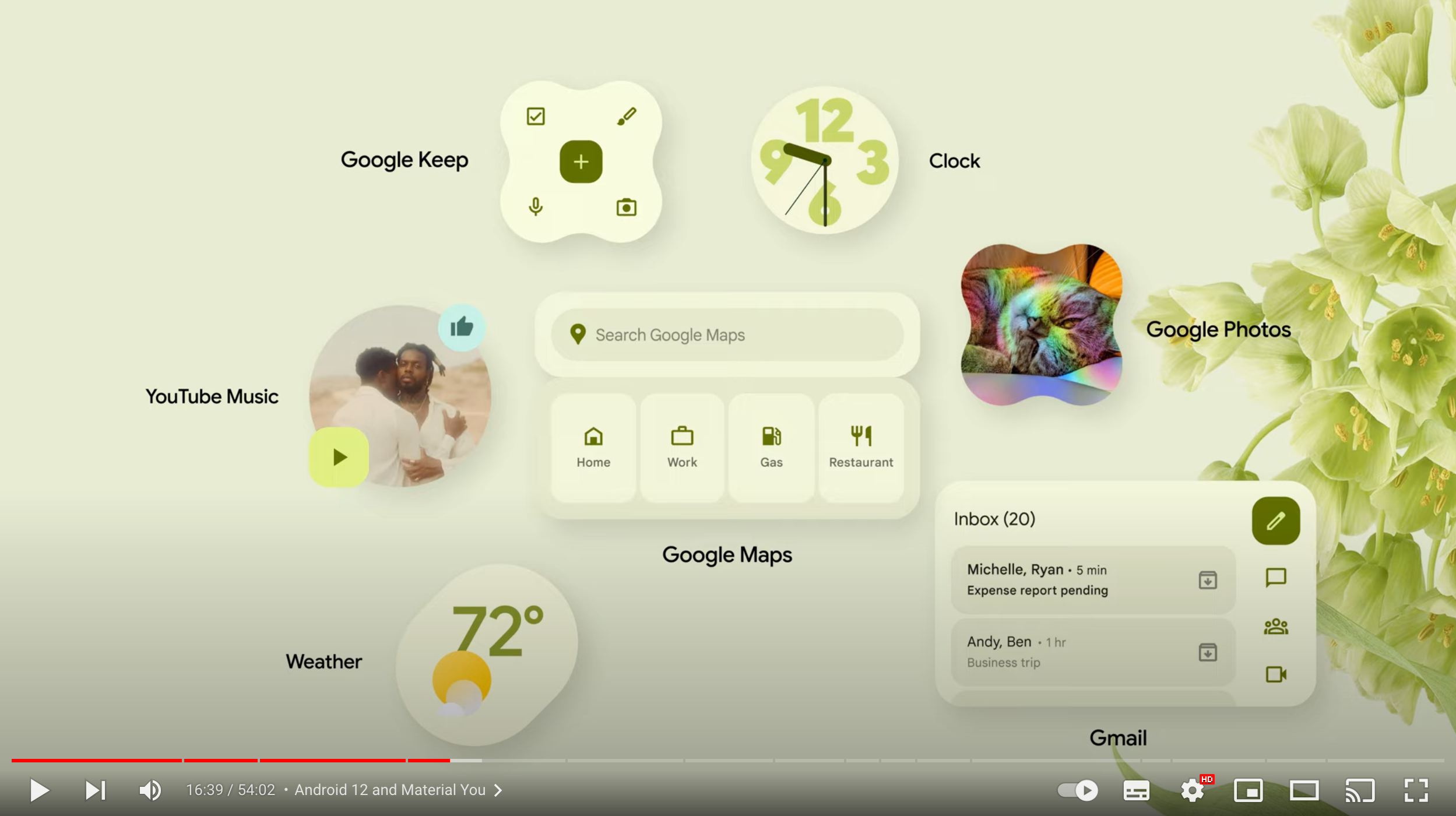 "Material You"는 이전 "Google I/O" 리뷰에서 설명한 것처럼(아래 '관련영상' 참고), 사용자가 설정한 이미지에서 '주색'과 '보조색'을 인식하고 이를 시스템 UI는 물론 캘린더, 앱, 아이콘 등이 모두 해당 컬러에 맞게 자동으로 변경되도록 지원된다. (관련영상🖥)