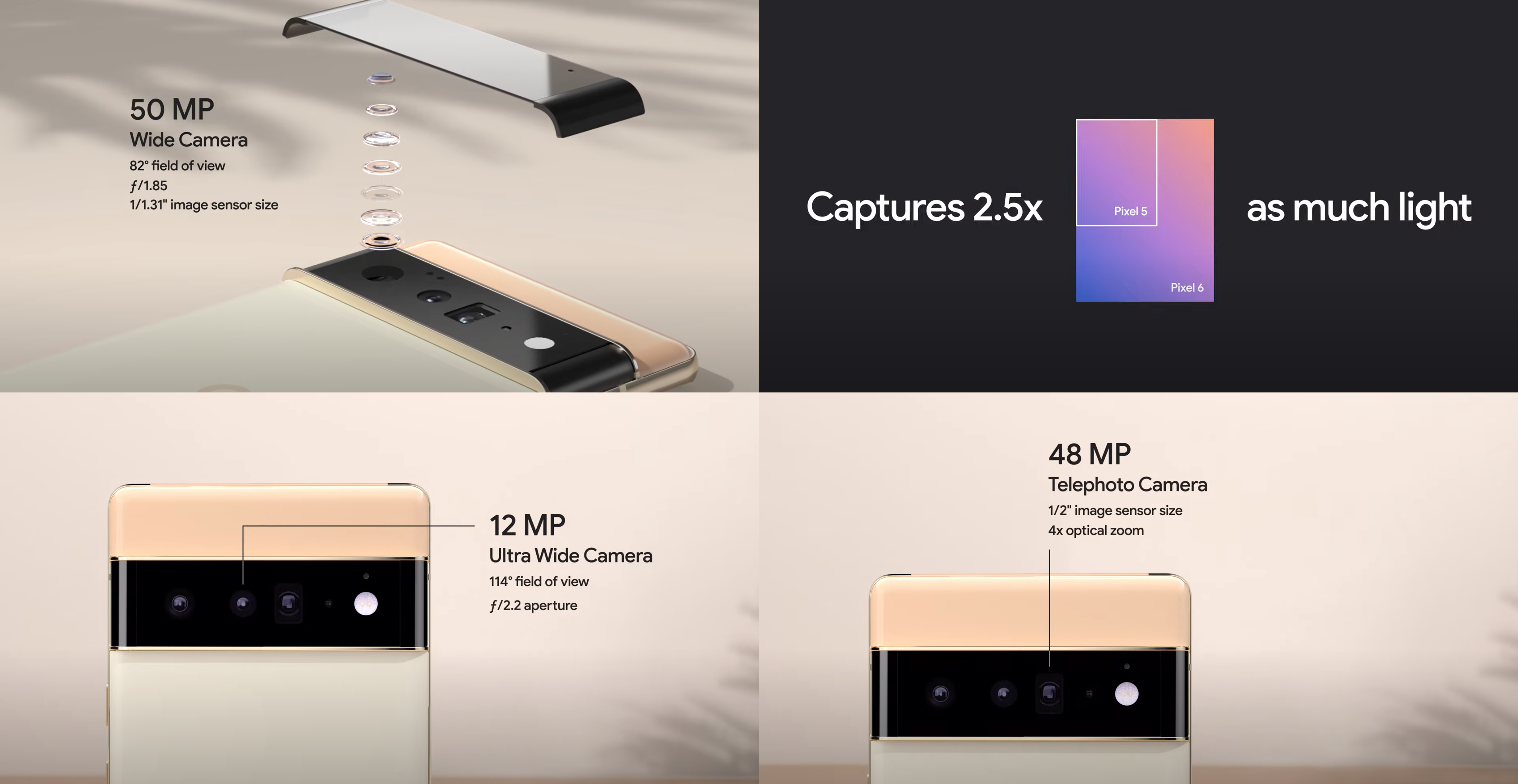 구글은 "Pixel 6 / 6 Pro"를 '현존하는 가장 뛰어난 스마트폰 카메라(Most advanced smartphone camera)'라고 할 만큼 차별화 된 기능을 제공하는데, 특히 하드웨어(카메라 구조, 이미지센서 크기 등)와 소프트웨어(AI Tensor)의 결합을 통해 우수한 결과물을 만들어 낼 수 있다고 밝혔다.