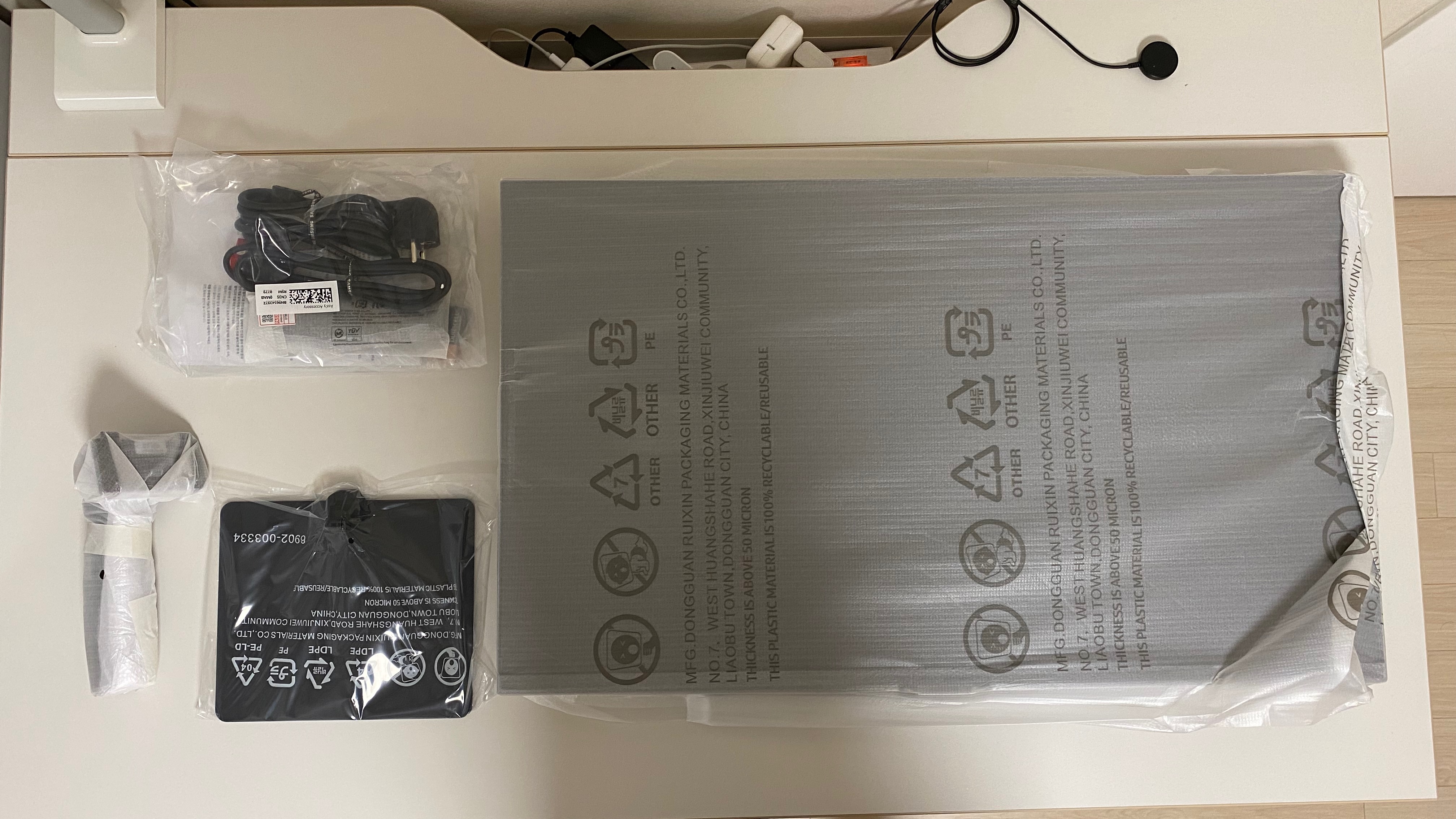 패키징은 역시 (모든 모니터가 그렇듯) 정말 단순한 ① 디스플레이(화면), ② 스탠드, ③ HDMI/전원 케이블로 구성되어 있었고 추가로 ④ 리모컨이 포함되어 있었다. 뒤에서 더 자세하게 이야기 하겠지만 [스마트모니터 M7]는 "OTT 기능이 탑재된 모니터"라서 제대로 사용하려면 꼭 필요한 요소였다.