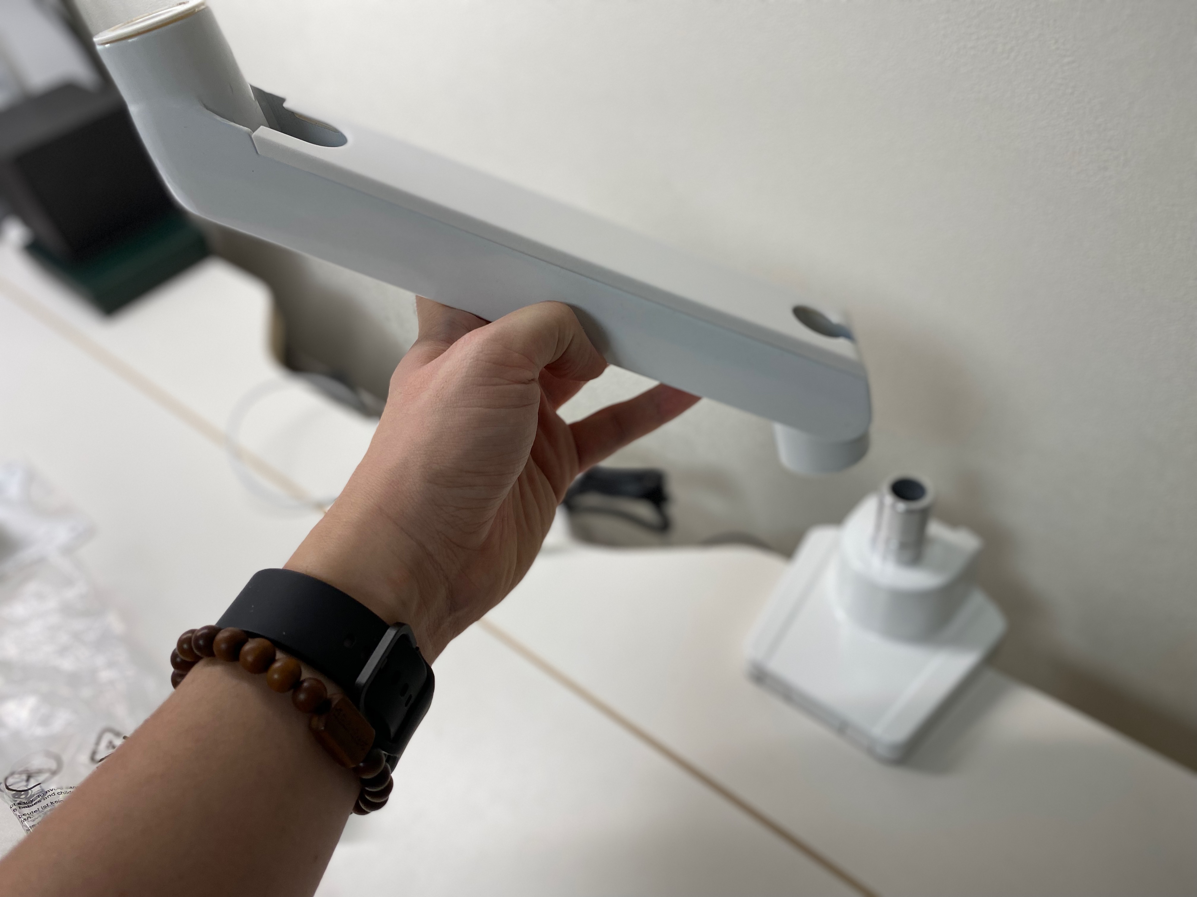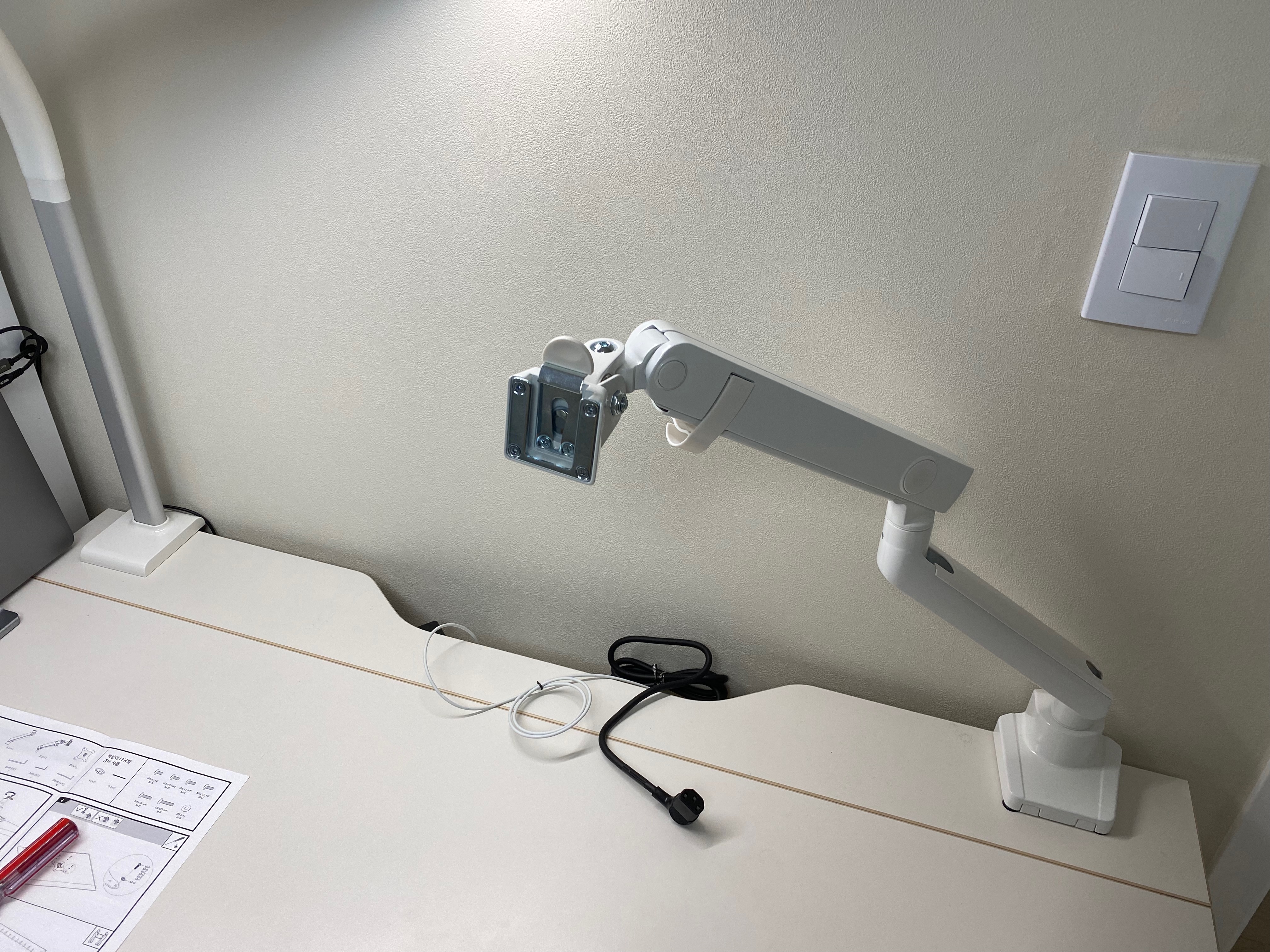 사진상 모니터암 색이 약간 "아이보리색"처럼 나왔는데 실제는 "찐! 하얀색"이다. "블랙" 색상은 쪼금만 있어도 하얀먼지가 늘 뽀얗게 앉아 청소가 힘들고, 책상도 하얀색이라 깔 맞춤을 하고 싶다는 생각에 "화이트" 색상으로 구매했다.