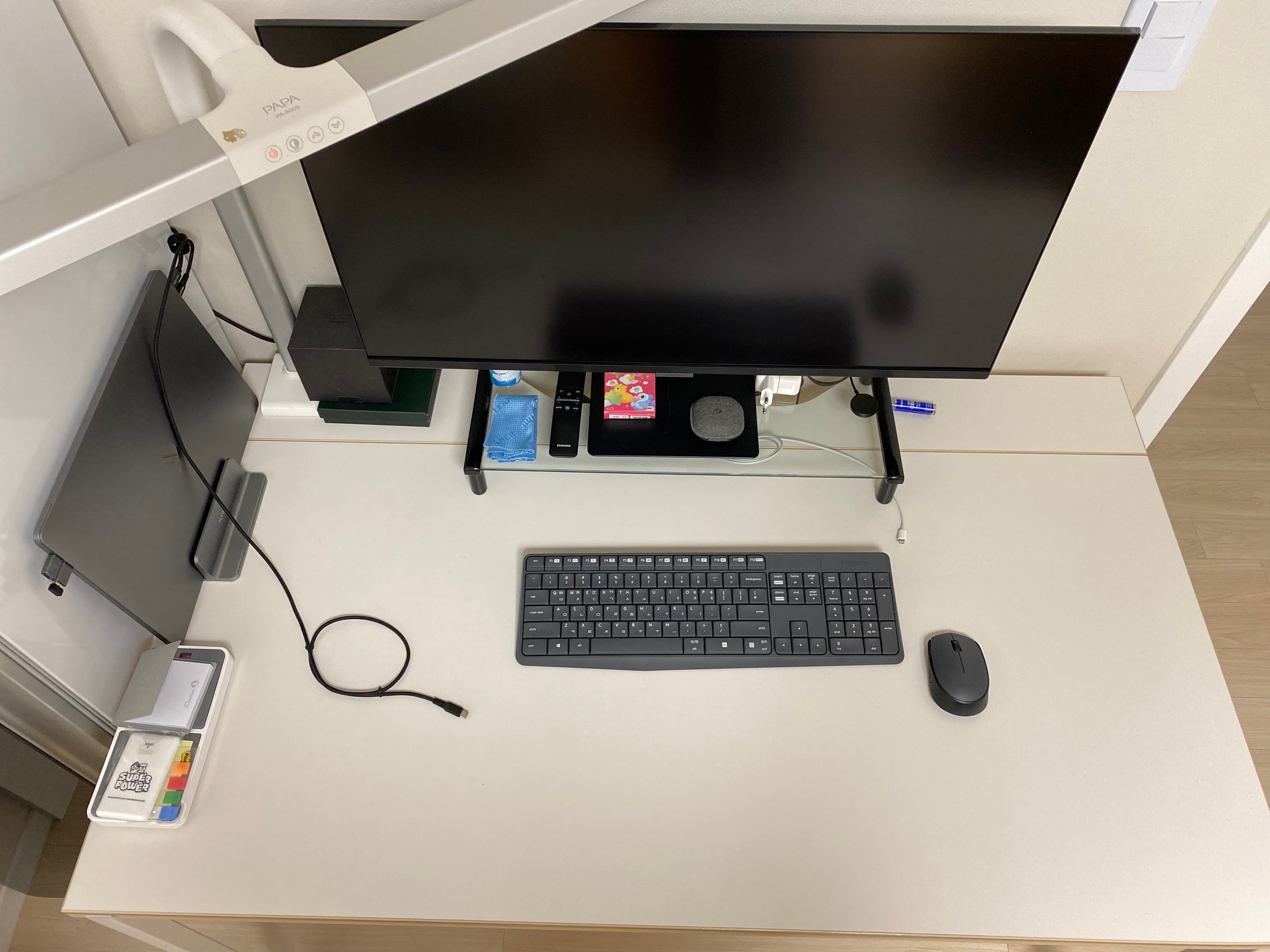 내 책상이 "데*커 컴퓨터 데스크"라 꽤 넓은 크기(W1200xD700mm)인데도 불구하고 모니터 때문에 "D180mm" 정도 되는 공간이 줄어들었다. 게다가 디자인 특성상 "멀티탭 공간"이 뚤려 있어서 모니터 받침대를 놓았는데 위를 덮어버리는 바람에 멀티탭을 쓸 수 없게 되어버리는 이중고까지 발생했다.