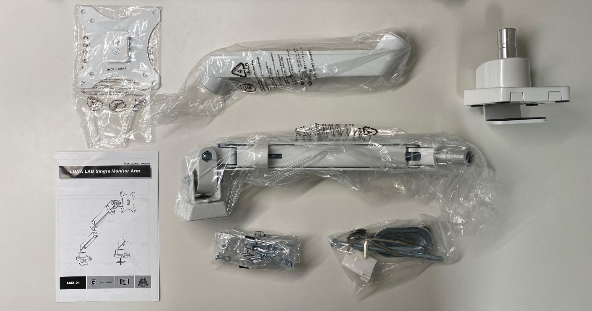 구성품은 생각보다 단순했다. 모니터에 붙이는 "①브라켓"와 "②암 2개(1차-2차)", 책상에 고정시키는 "③클램프"와 '모니터'와 '브라켓'을 고정하는 "④사이즈별 나사"가 들어있었다. 추가로 타공이 되어 있는 책상을 위한 "⑤그로밋" 부속도 포함되어 있었다.