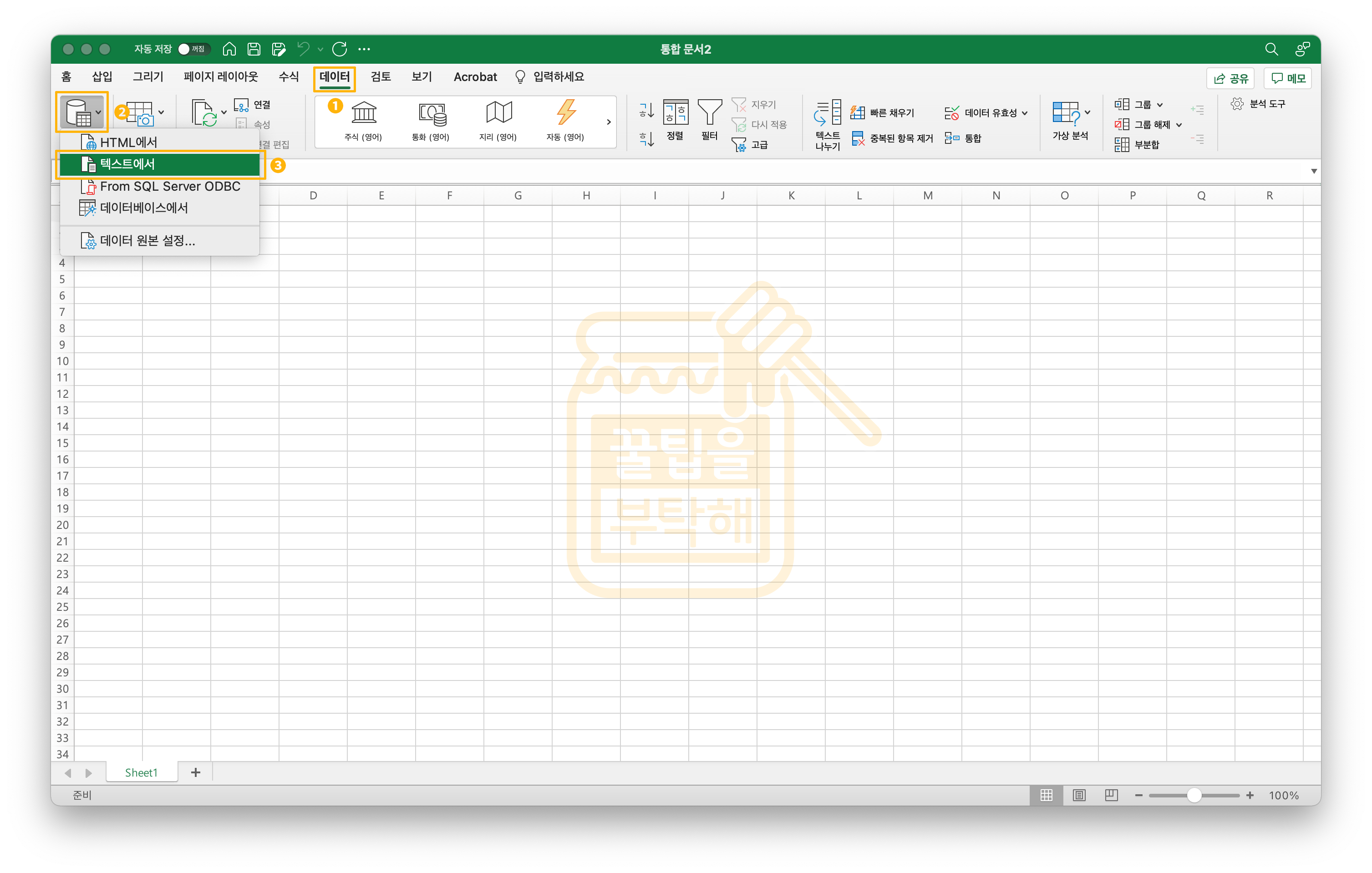 1. 먼저 엑셀 상단 메뉴에서 [데이터] → [데이터 가져오기] → [텍스트에서]를 차례로 선택한다.