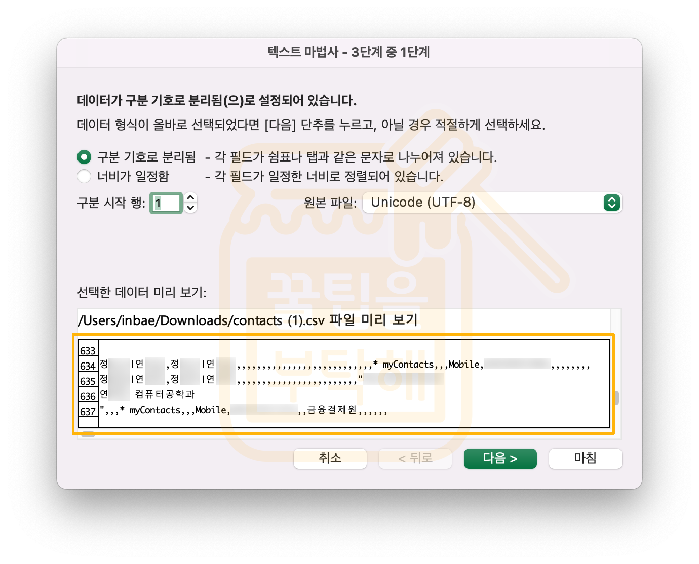 3. 다음 "텍스트 마법사" 창이 나타나면 먼저 [구분 기호로 분리됨]을 선택하고 "원본파일"에서 [Unicode (UTF-8)]을 선택한다. 선택이 제대로 되면 아래 이미지처럼 "미리보기" 영역에 한글이 제대로 표시된다. [다음]을 눌러 다음 단계로 넘어간다.