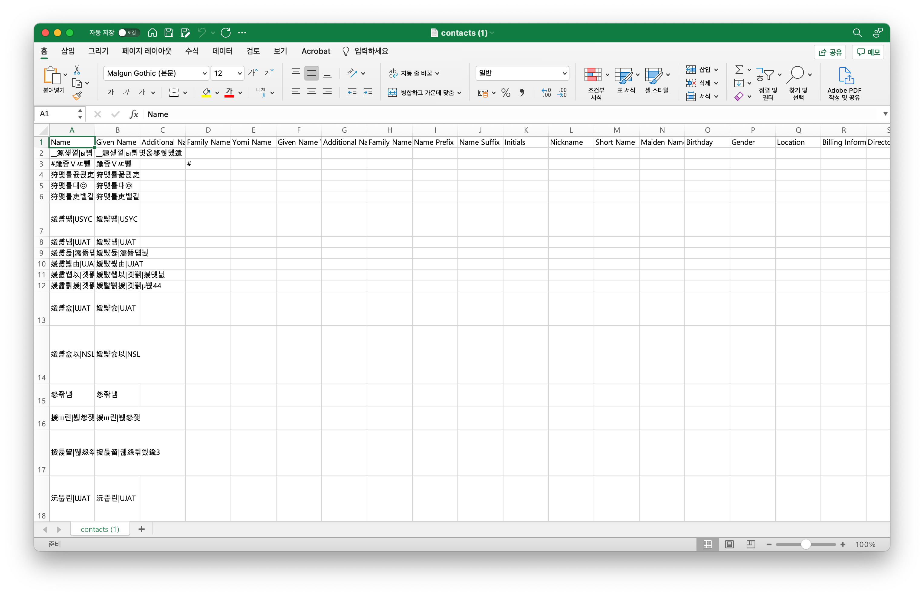 "구글 연락처"에서 받은 "CSV 파일""MAC용 엑셀"에서 열었더니