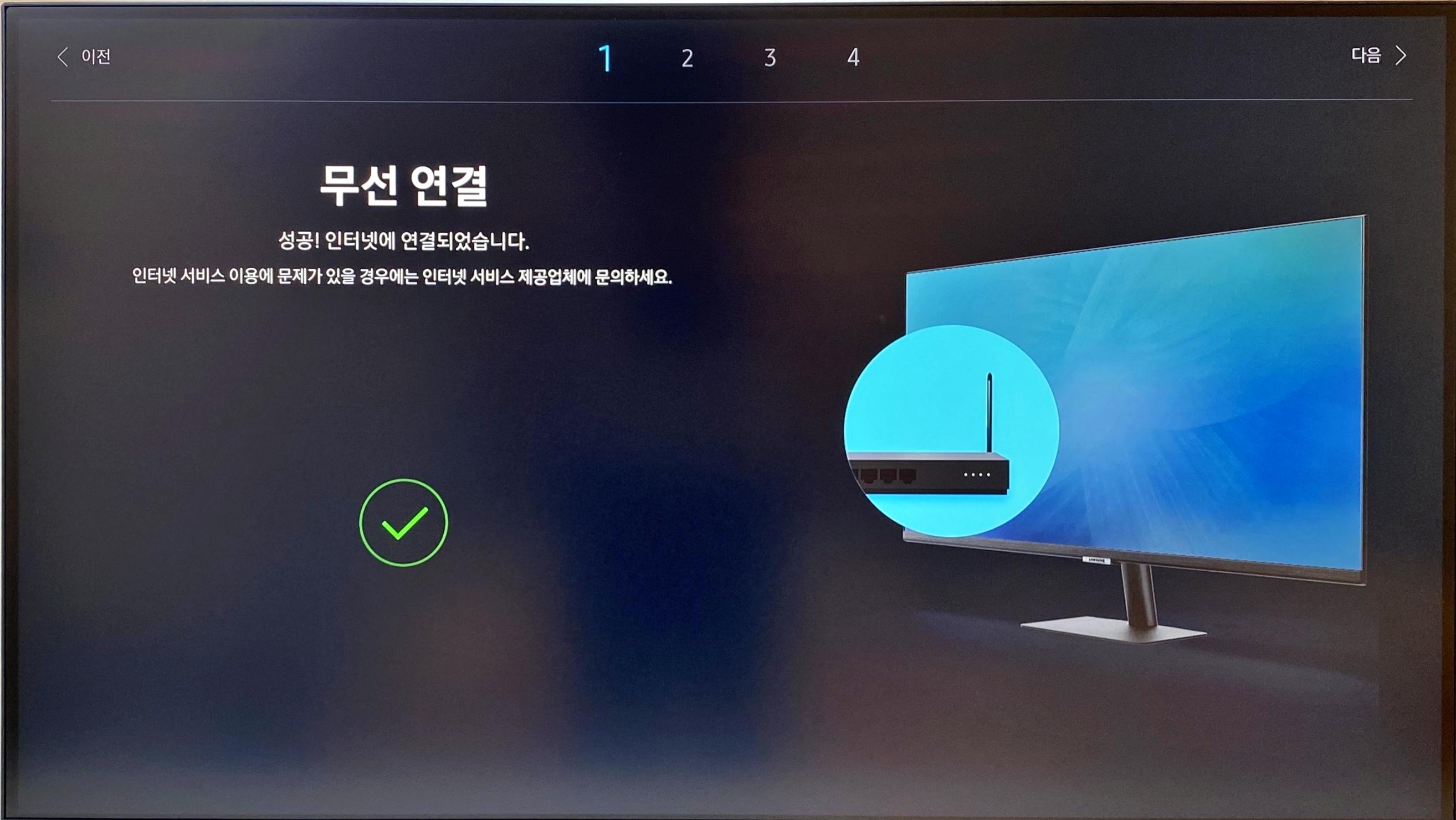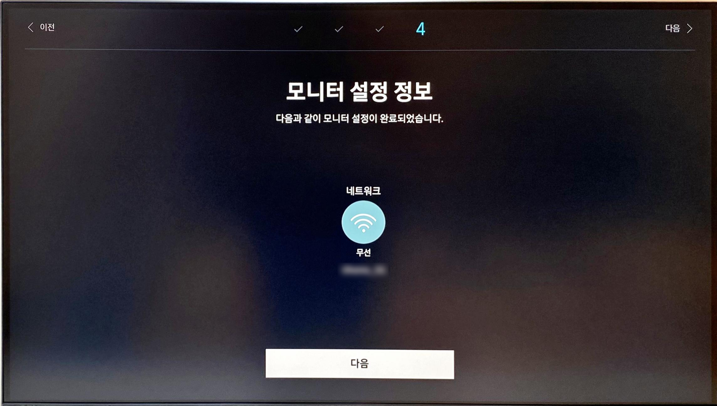 다음 화면에서는 모니터를 네트워크에 연결하는 과정을 진행한다. 기본적으로 모니터에 "랜(LAN)" 포트가 없기 때문에 무선으로 연결되는데, 모니터에서 각종 OTT 서비스를 이용하게 되므로 필수적으로 거쳐야 하는 단계이다.