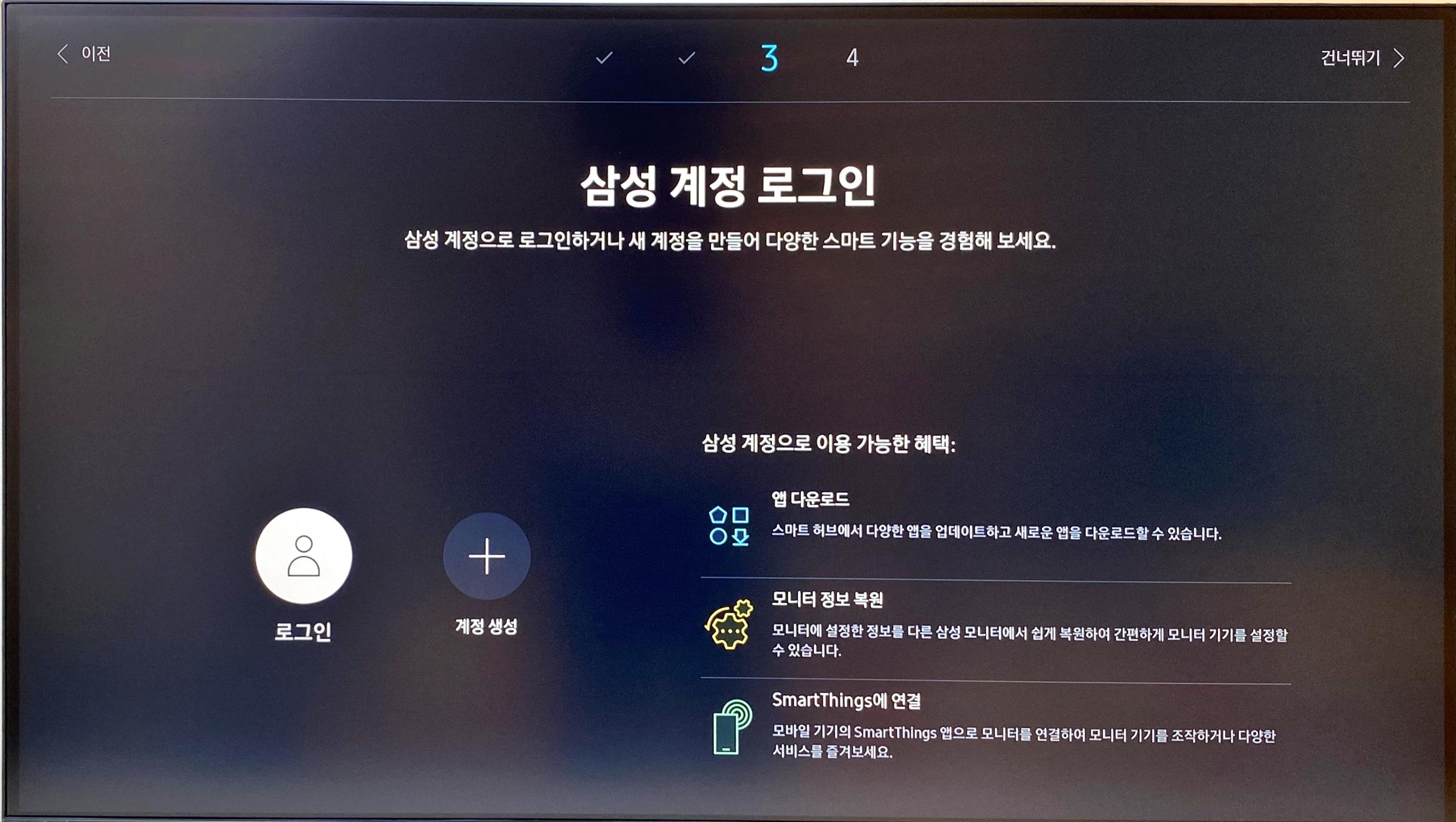 이어서 본인이 가지고 있는 '삼성 계정'을 로그인 할 수 있는 단계로 넘어간다. [삼성 계정 로그인]을 하면 앱 다운로드, 모니터 정보 복원(각종 설정값), SmarThings를 통한 모바일에서 기기 제어 등을 사용할 수 있게 된다고 한다. (나는 굳이 ... 라는 생각에 Pass하긴 했다.)