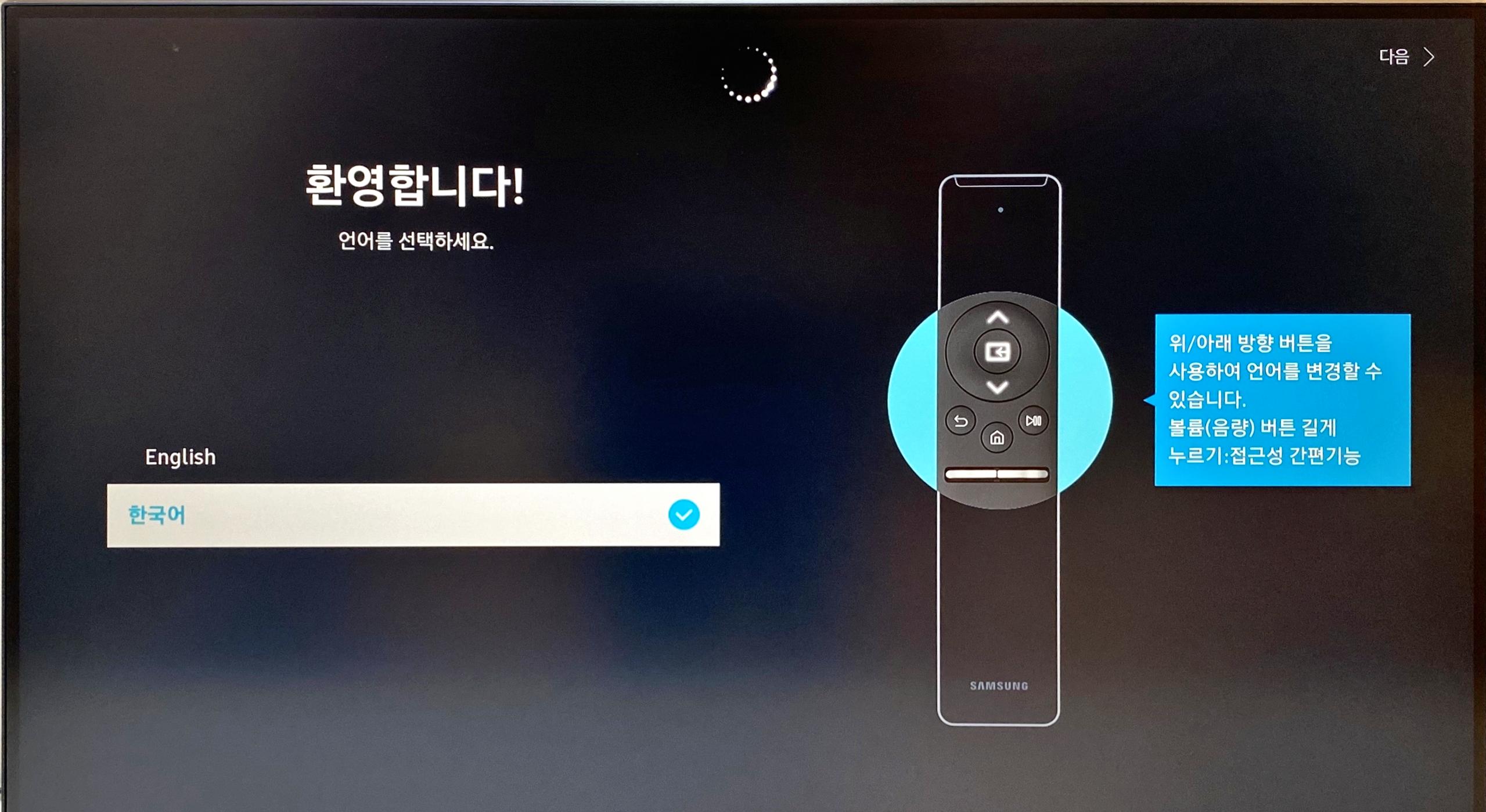 첫 화면에서는 시스템에서 사용할 [언어]를 선택하고, 동시에 [리모컨 페어링] 과정이 이루어진다.