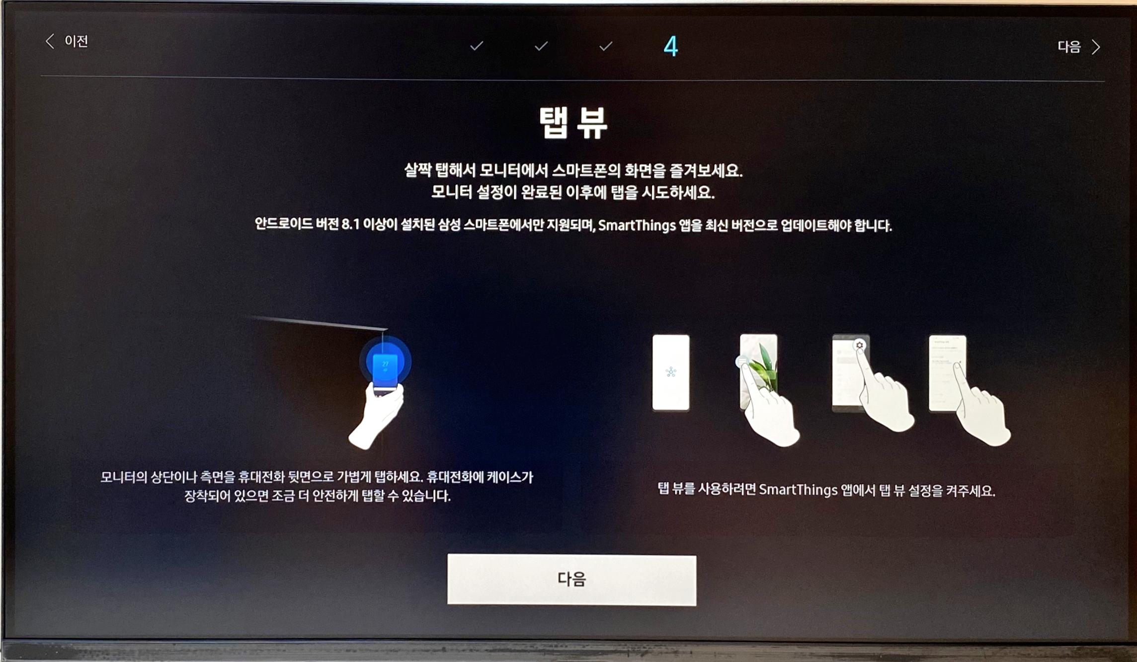 라고 생각했는데, "별책부록" 같은 꿀 기능인 [탭 뷰]에 대한 안내가 이어졌다. [탭 뷰]는 폰을 모니터 모서리에 "콩"하고 찍으면 화면을 바로 공유(미러링)하거나, 시청하고 있는 영상을 바로 이어 재생할 수 있도록 하는 기능이다. (자세한 시연영상은 아래 비디오를 참고)