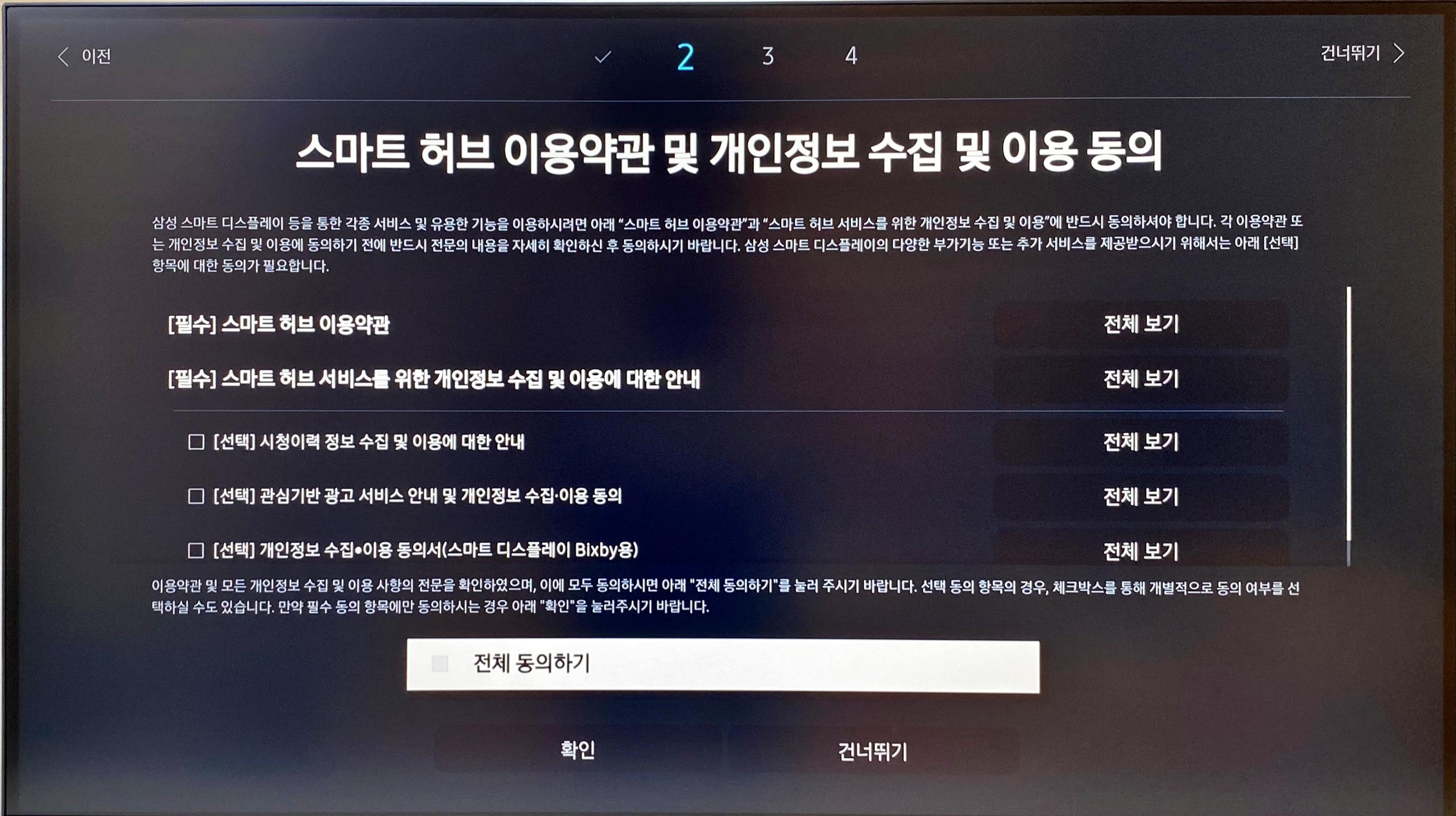 다음은 삼성에서 제공하는 [스마트 허브]를 이용하기 위해 이용약관에 동의를 하는 과정이다.
