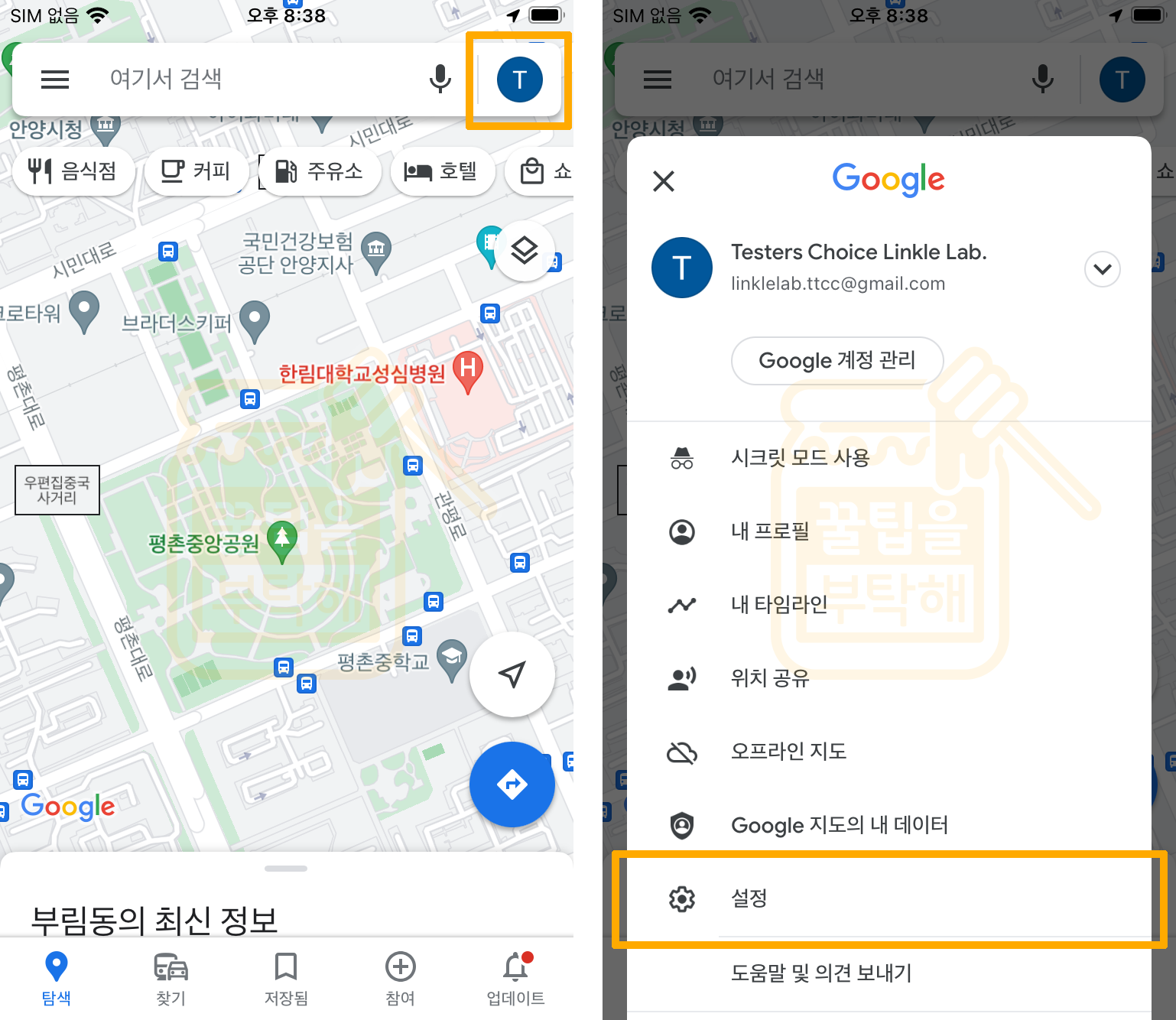 5. 구글 지도(Google Maps) 앱을 다시 실행하고 우측 상단에 있는 [프로필] 아이콘을 선택한다. 메뉴가 나타나면 아래 [설정]을 눌러 설정메뉴로 들어간다.