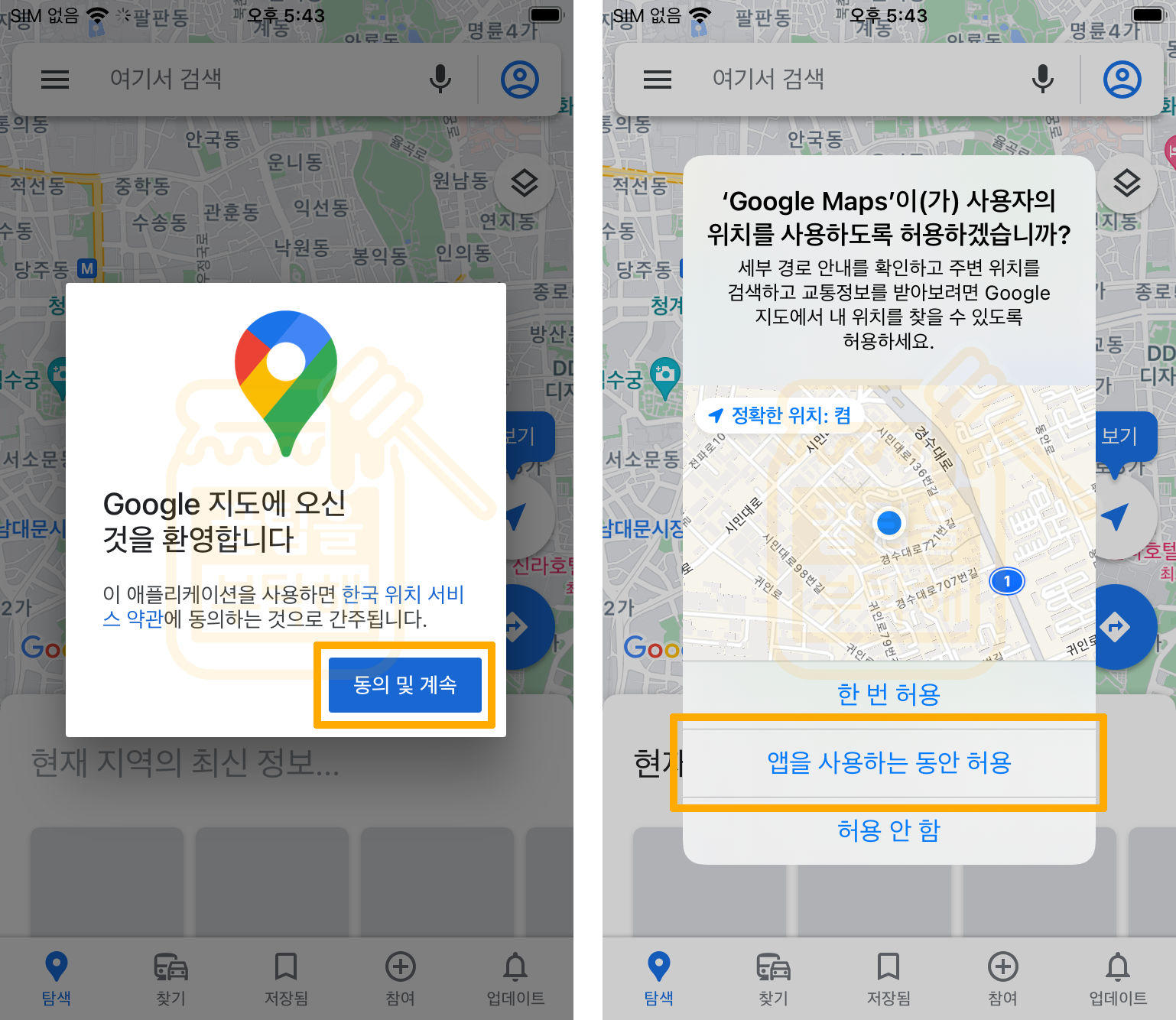 2. 앱을 처음 실행하면 나오는 팝업들이 나타나는데, "위치 서비스 약관"에 [동의 및 계속]을 선택하고, "위치사용 허용"에서 [앱을 사용하는 동안 허용]을 선택한다. ("위치사용 허용"은 [설정]에서 다시 변경할 예정이므로 큰 의미는 없음)