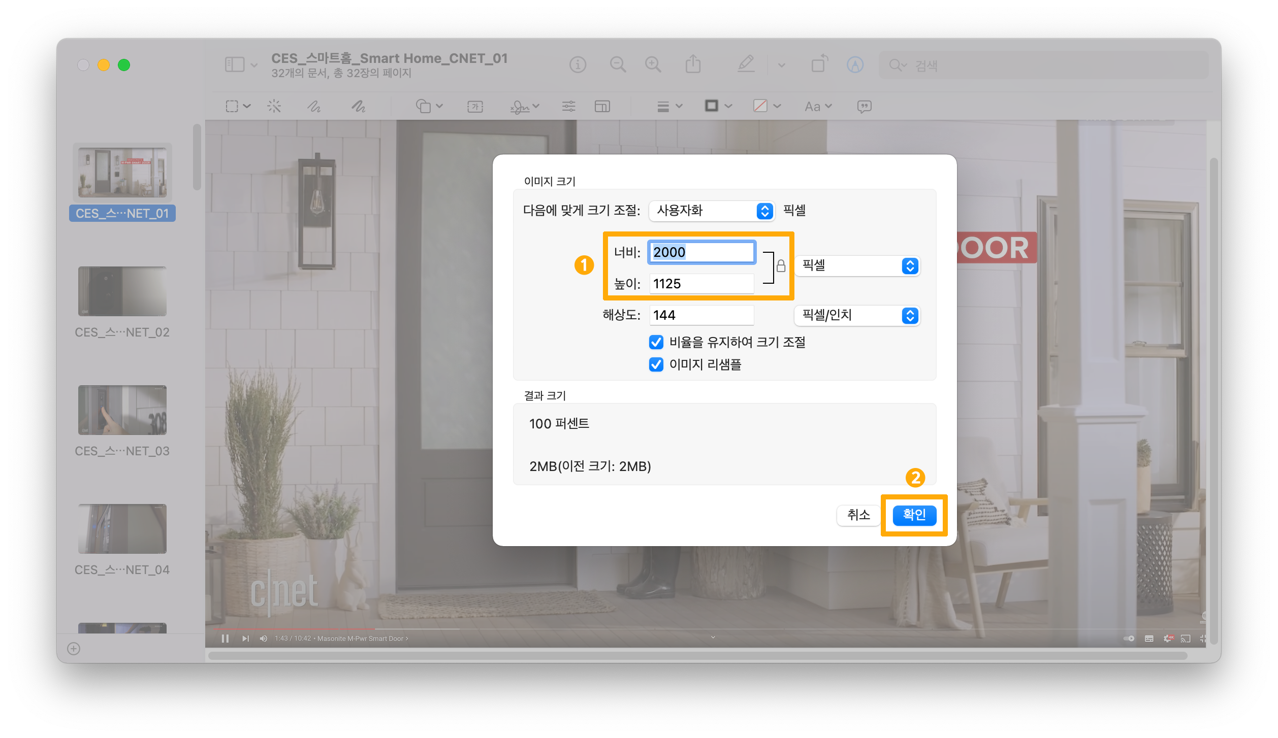 5. '미리보기' 창으로 돌아오면 이미지 사이즈가 변경된 것을 알 수 있다. 이 상태에서 [종료] 버튼 또는 [Command]+[Q]를 눌러 '미리보기' 창을 닫으면 자동으로 변경된 이미지를 저장한 후에 종료된다. (각 이미지를 선택해서 저장할 수 있지만, 귀찮으니 한번에 해결하는 방법!)