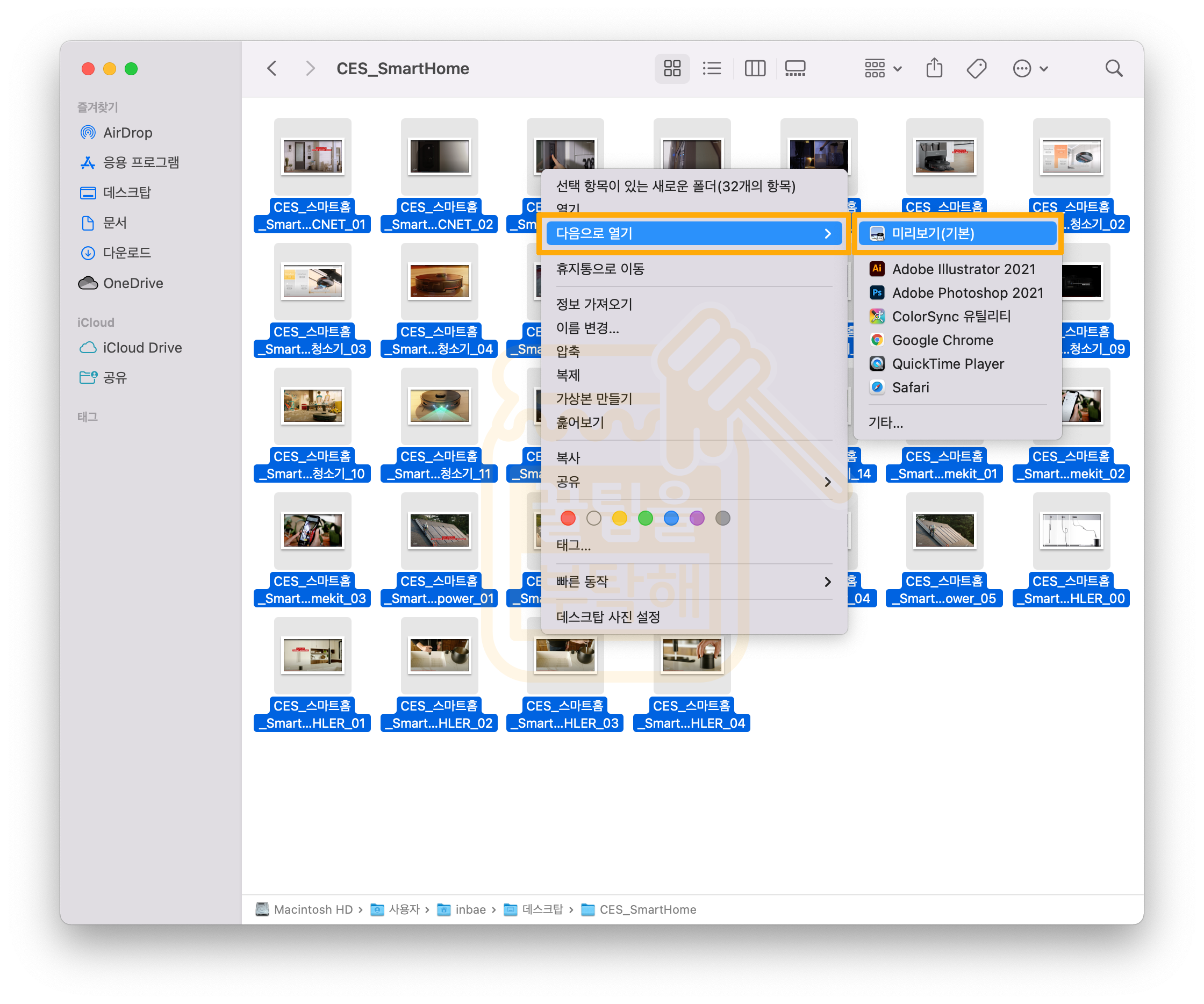 1. 사이즈를 변경할 이미지를 모두 선택하고 [마우스 오른쪽 버튼]을 클릭한다. 메뉴에서 [다음으로 열기]와 [미리보기(기본)]를 차례로 선택한다.