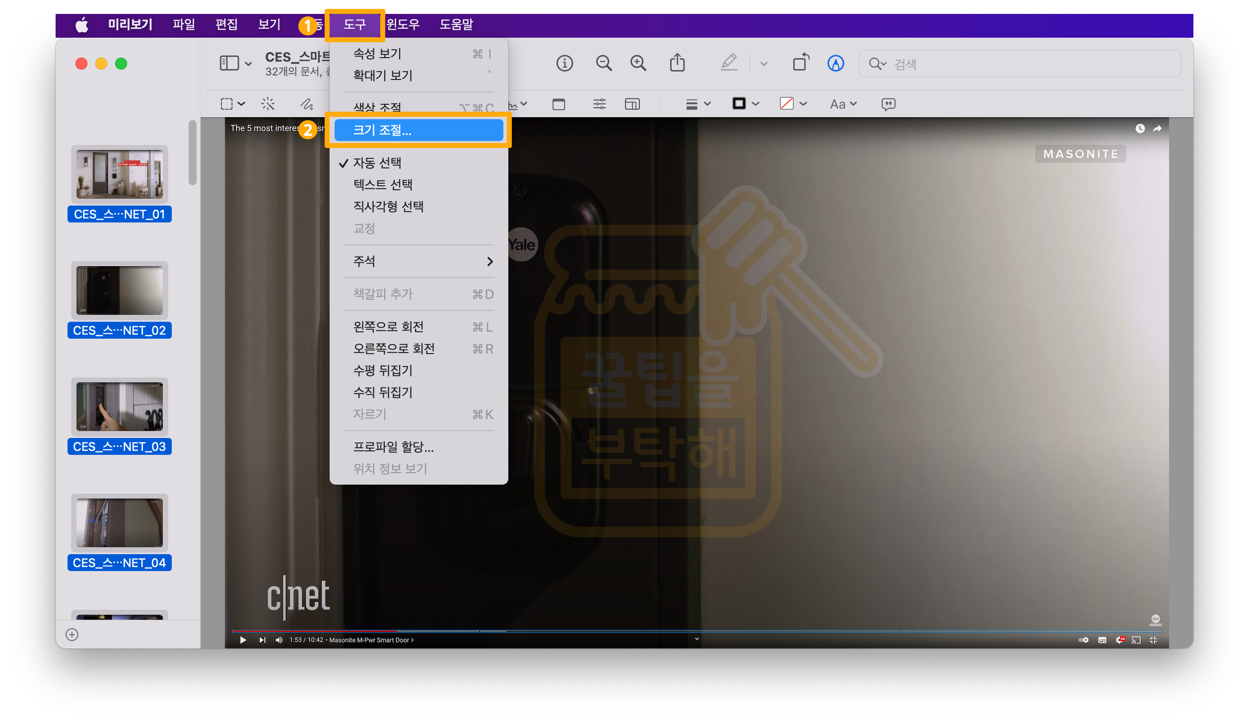 3. 선택이 완료되면 화면 위에 있는 '메뉴막대'에서 [도구]를 선택하고 아래 [크기 조절...]을 선택한다.