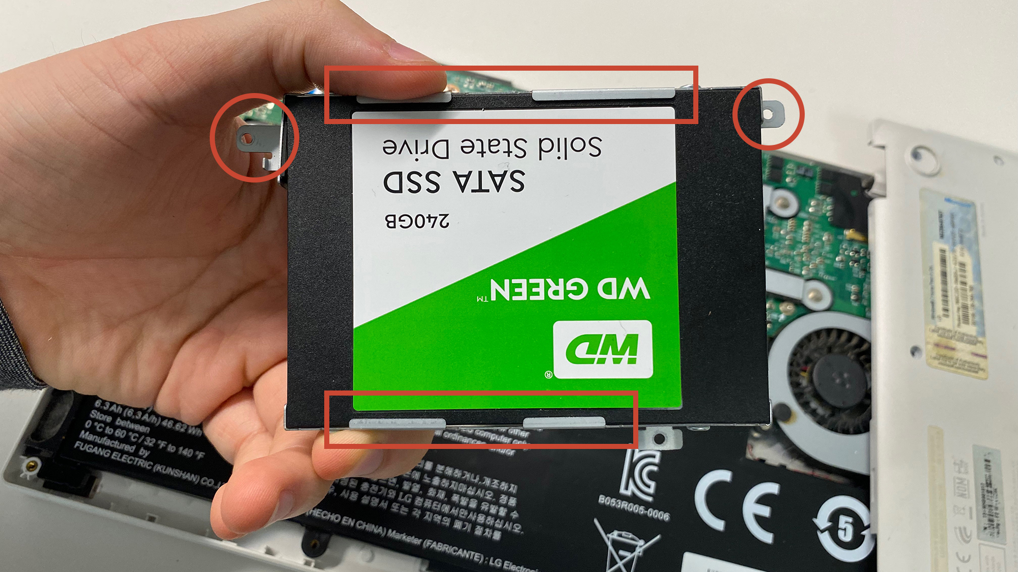 8. 기존 HDD 자리에 SSD를 결합하는데 이 때 방향을 주의해야 한다. 2번째 이미지처럼 ① 커버(어댑터) 아래 받쳐주는 금속 부분이 WD 브랜드 로고가 보이는 면을 향하게 하고, ② 위-아래 나사 결합 부분이 하얀색 쪽으로 오게 결합해야 한다. (WD SSD 기준으로 SSD 모델에 따라 다를 수 있음)