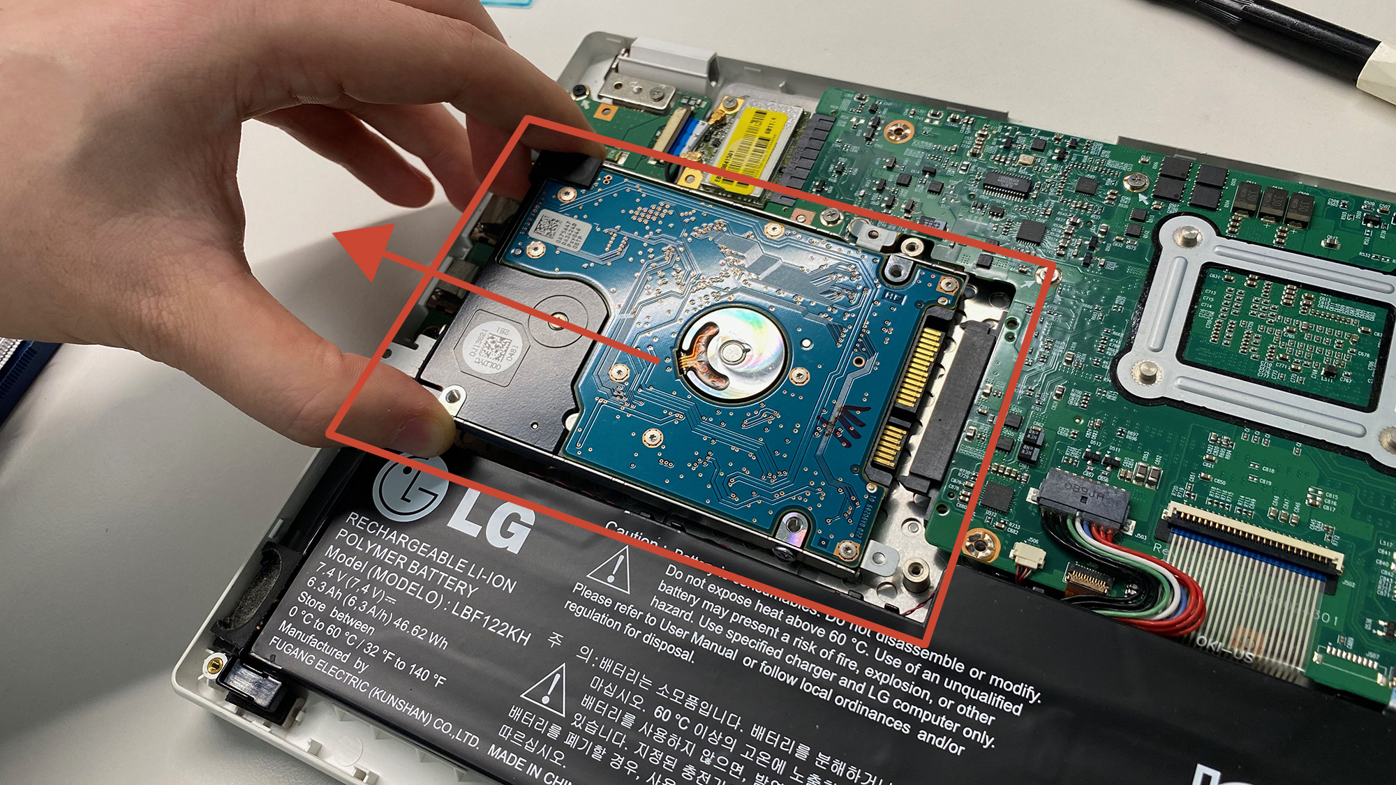 6. 나사를 모두 분해하면 HDD 왼쪽 끝을 살짝 들어 올려서 잡고 오른쪽에서 왼쪽으로 잡아당기듯 빼준다.