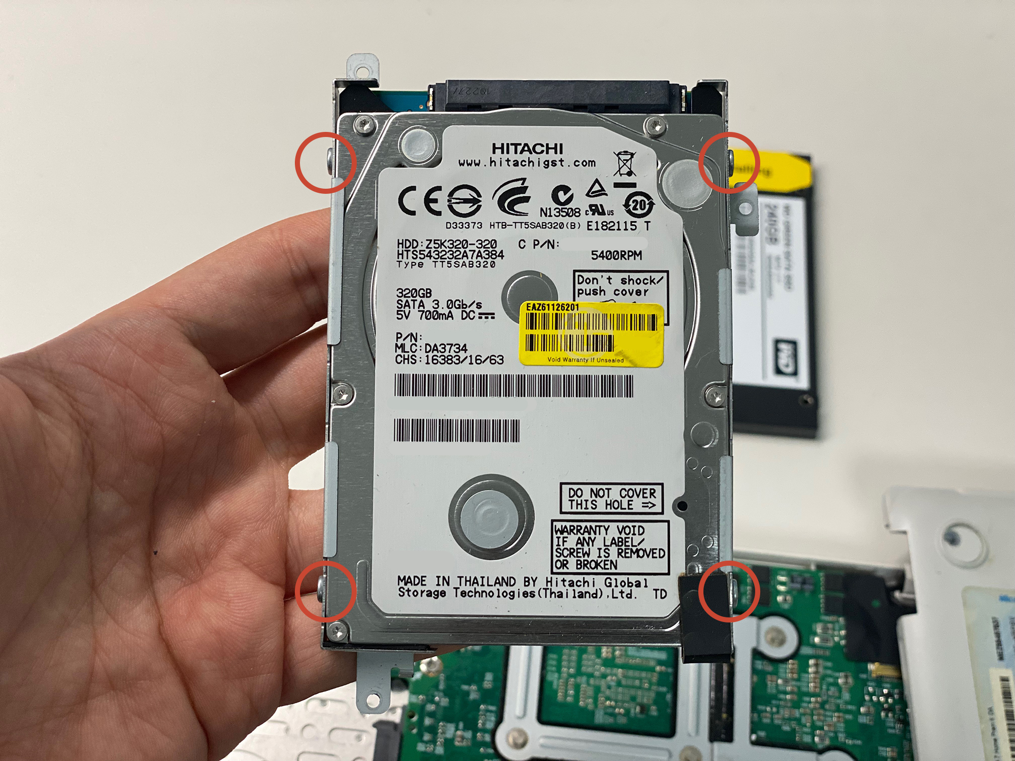 7. 기존 HDD는 커버(어댑터) 역할을 하는 좌우 얇은 금속에 붙어있기 때문에 표시된 4개의 나사를 모두 풀어 분해한다.