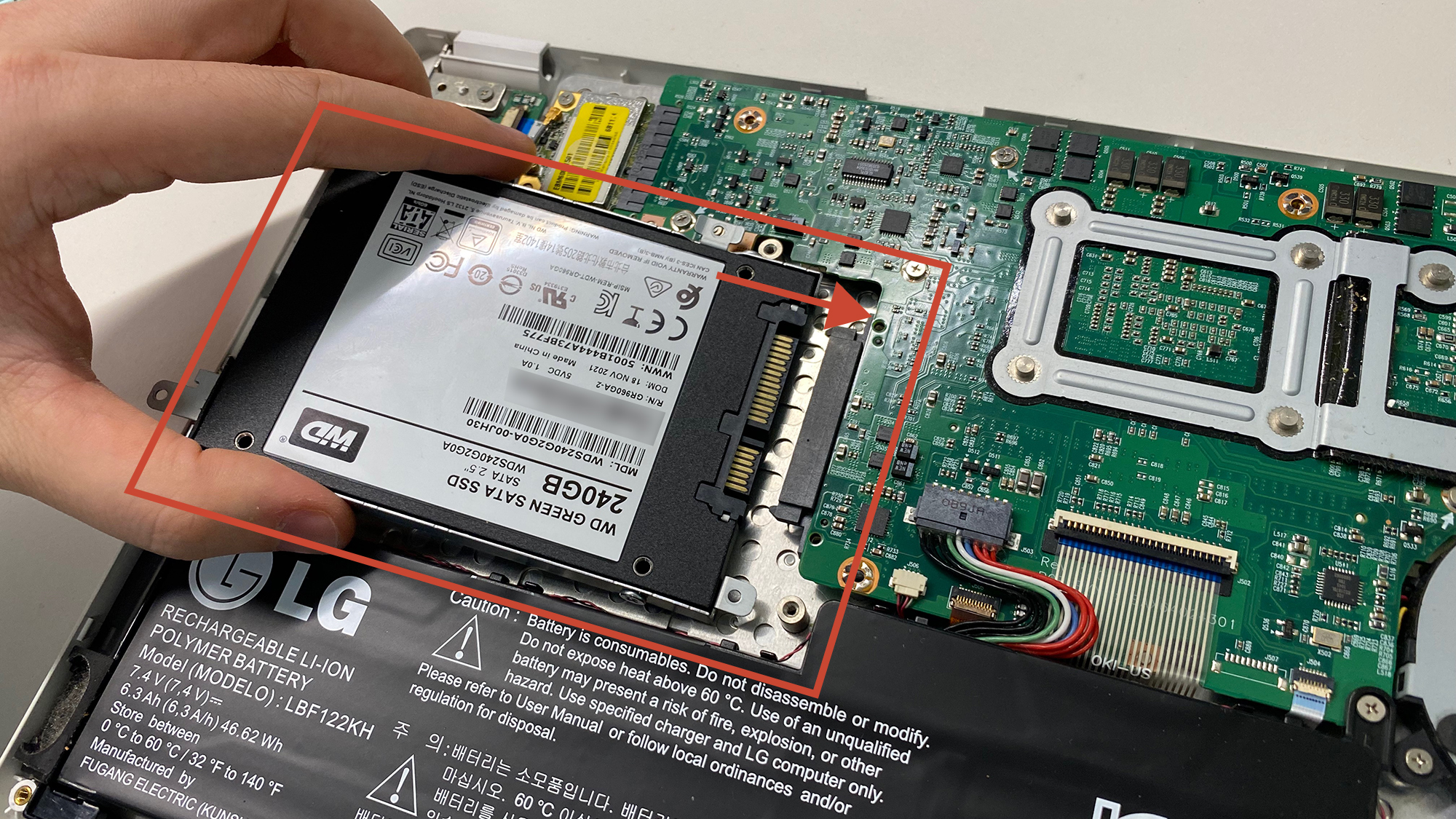 9. 분해는 역순! 커버(어댑터)에 결합한 SSD를 왼쪽에서 오른쪽으로 밀어넣듯 눌러 넣어 장착시킨다. 이 때 SSD 어댑터 부분과 메인보드에 있는 포트 모양이 맞는지 확인 후에 힘을 주어야 한다. (SATA 어댑터는 길이가 다르고 끝모양이 ㄱ자로 되어 방향성이 있음)