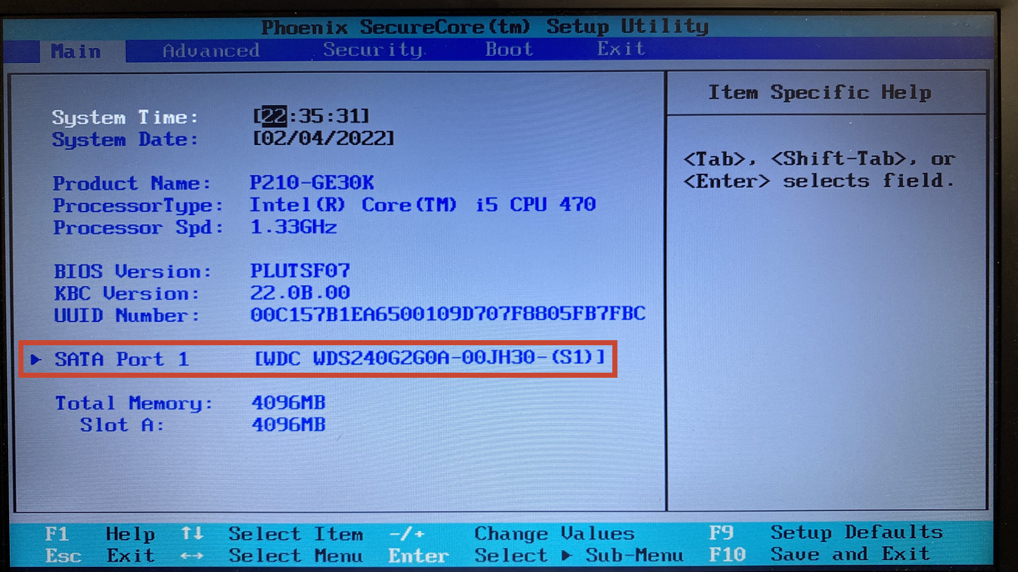 12. 전원을 켜고 [F2]를 눌러 BIOS에 진입한 후 [Main] 메뉴 아래 SATA Port 1에 설치한 SSD의 이름이 뜬다면 성공이다. (혹시 아무것도 뜨지 않는다면 SSD가 불량이거나 정상적으로 장착되지 않았을 가능성이 있음)