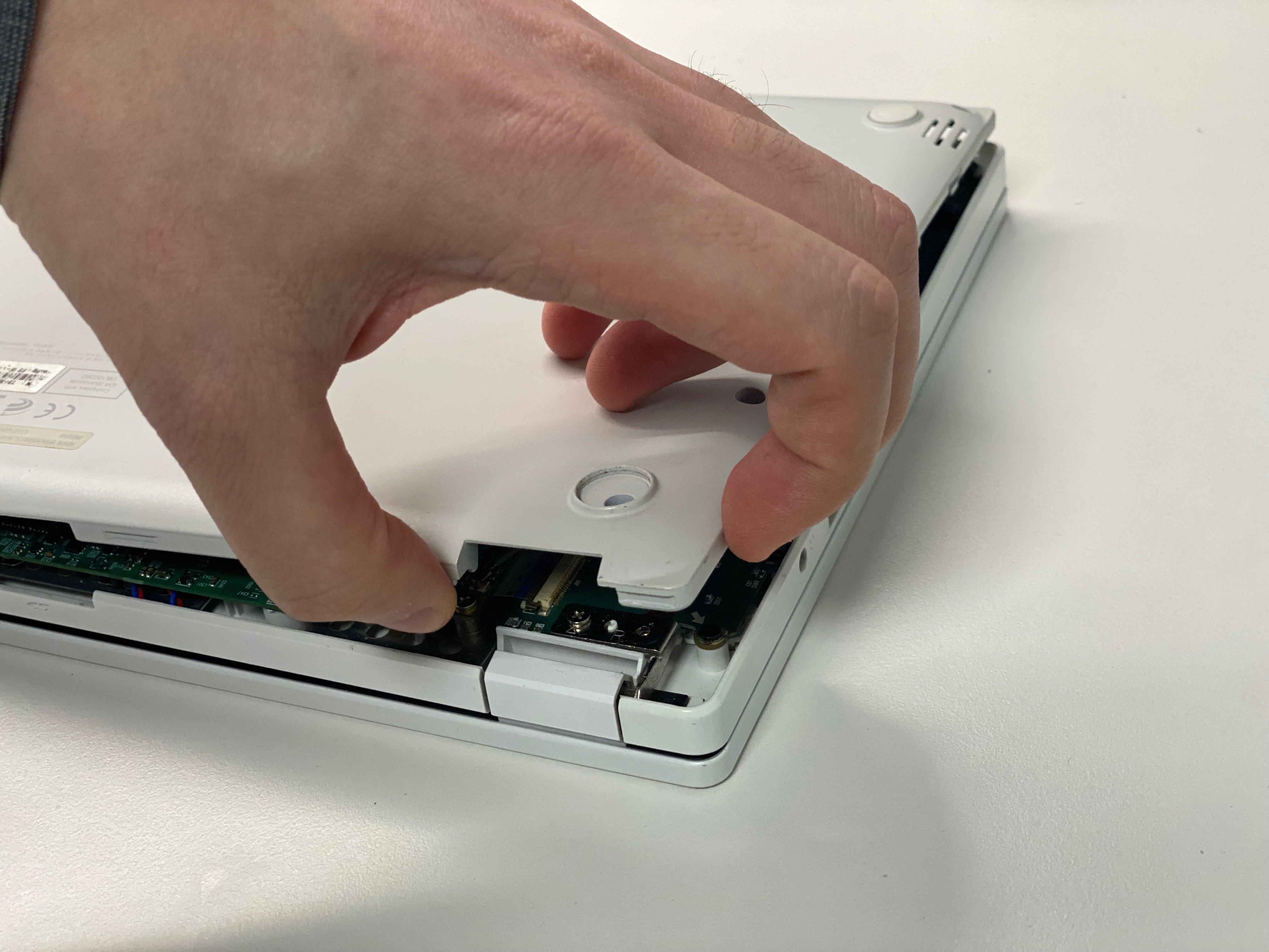 2. 노트북 뒷면 아래 'SD카드' 슬롯에 플라스틱 헤라 등을 넣고 천천히 힘을 주며 뒷판을 뜯어준다. 사실 이 때 가장 플라스틱을 깨먹기 쉽기 때문에 무작정 힘을 주고 앞뒤로 움직이기 보다는, 걸림쇠(플라스틱 고리) 부분을 '딸깍' 소리가 나도록 들어 올려(또는 젖혀서) 빼준다는 느낌으로 해야 안전하게 분해할 수 있다. (오래 될수록 플라스틱이 약해져 있기 때문에 힘 조절이 중요!)