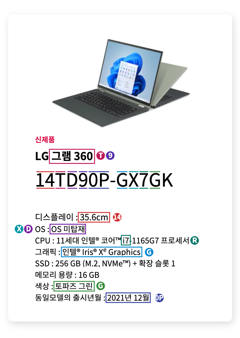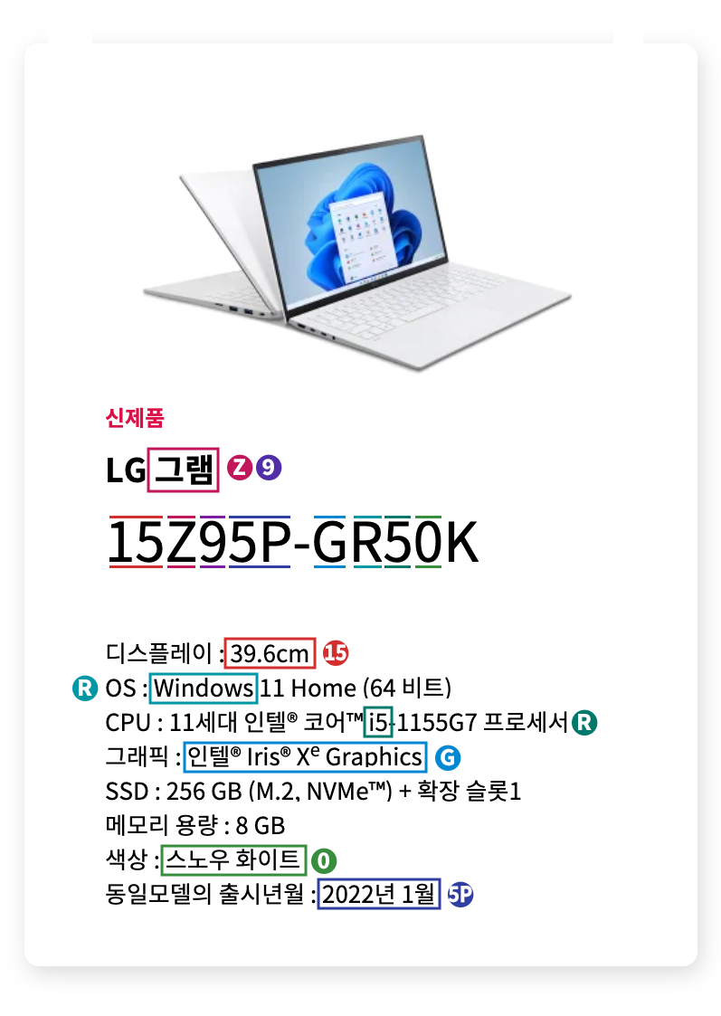 이전글과 비교해서 달라진 내용은 ②시리즈에 'G(울트라기어)'가 추가가 되었고 ⑤출시년도에 '5P(2022년 출시)', ⑥그래픽에 '추가사양(RTX, GTX 등)', ⑨색상에 'G(토파즈그린)'이 새로 생겼다는 점이다.