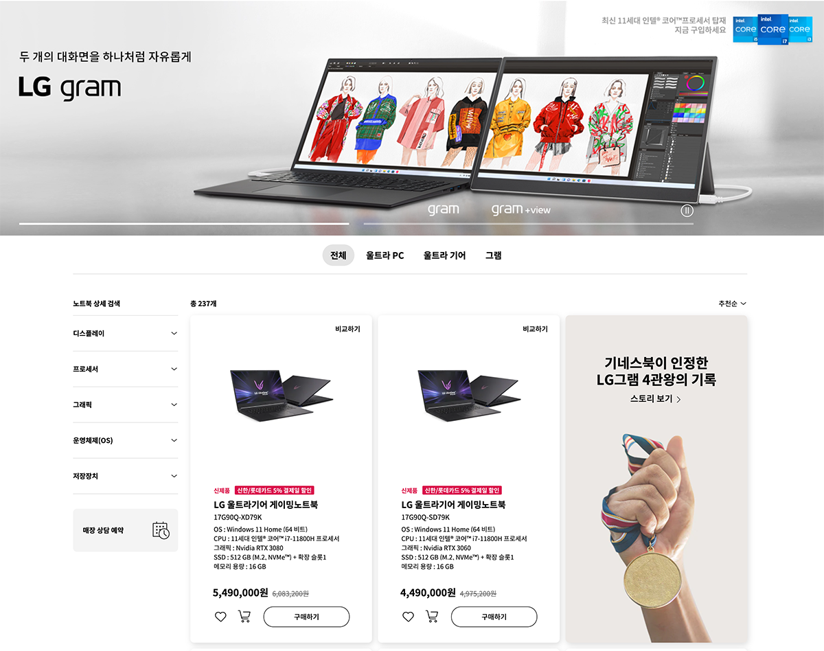 실제 LG전자 홈페이지(https://www.lge.co.kr/notebook)에서 찾아보면, 이 공식과 전혀 다른 스펙을 가지고 있는 모델도 있었다.😱 (*특히 색상이 블랙-화이트로 전혀 반대인 치명적인 경우도 있음!)