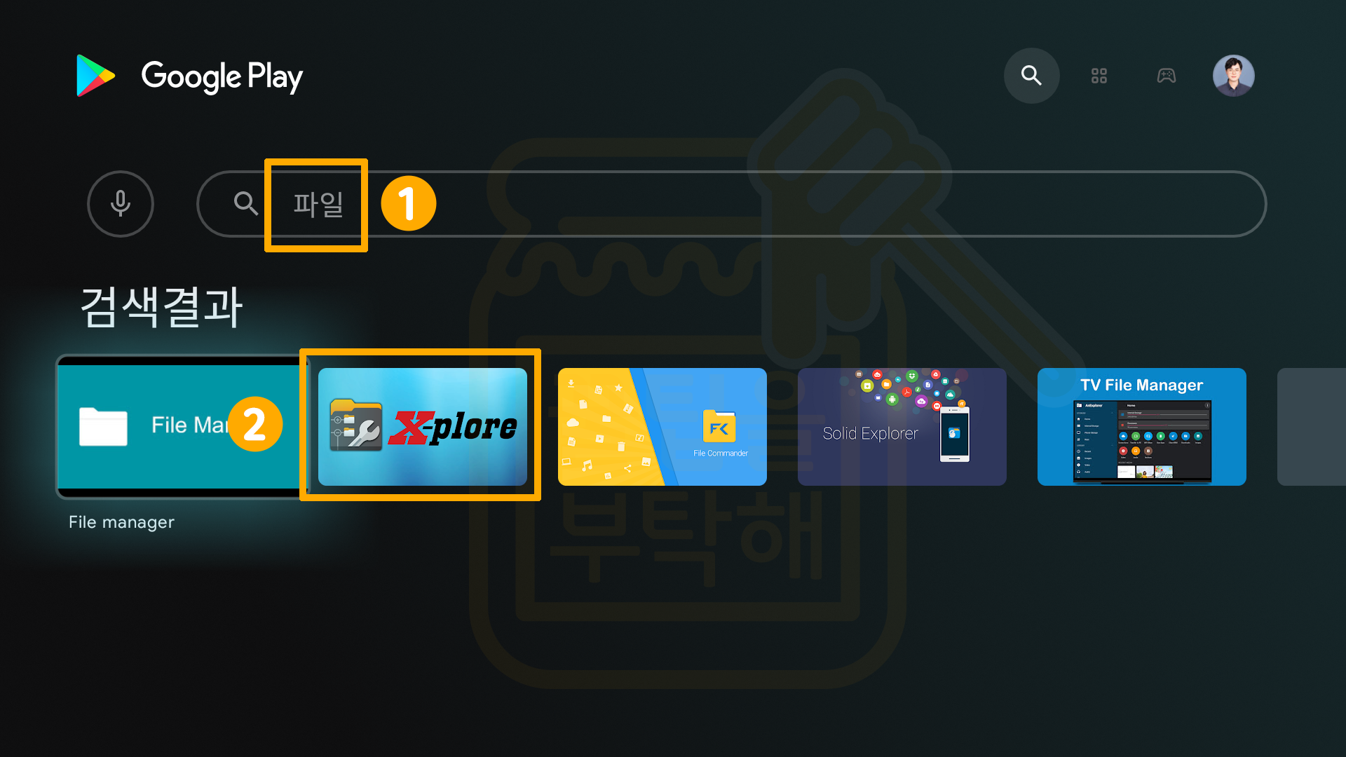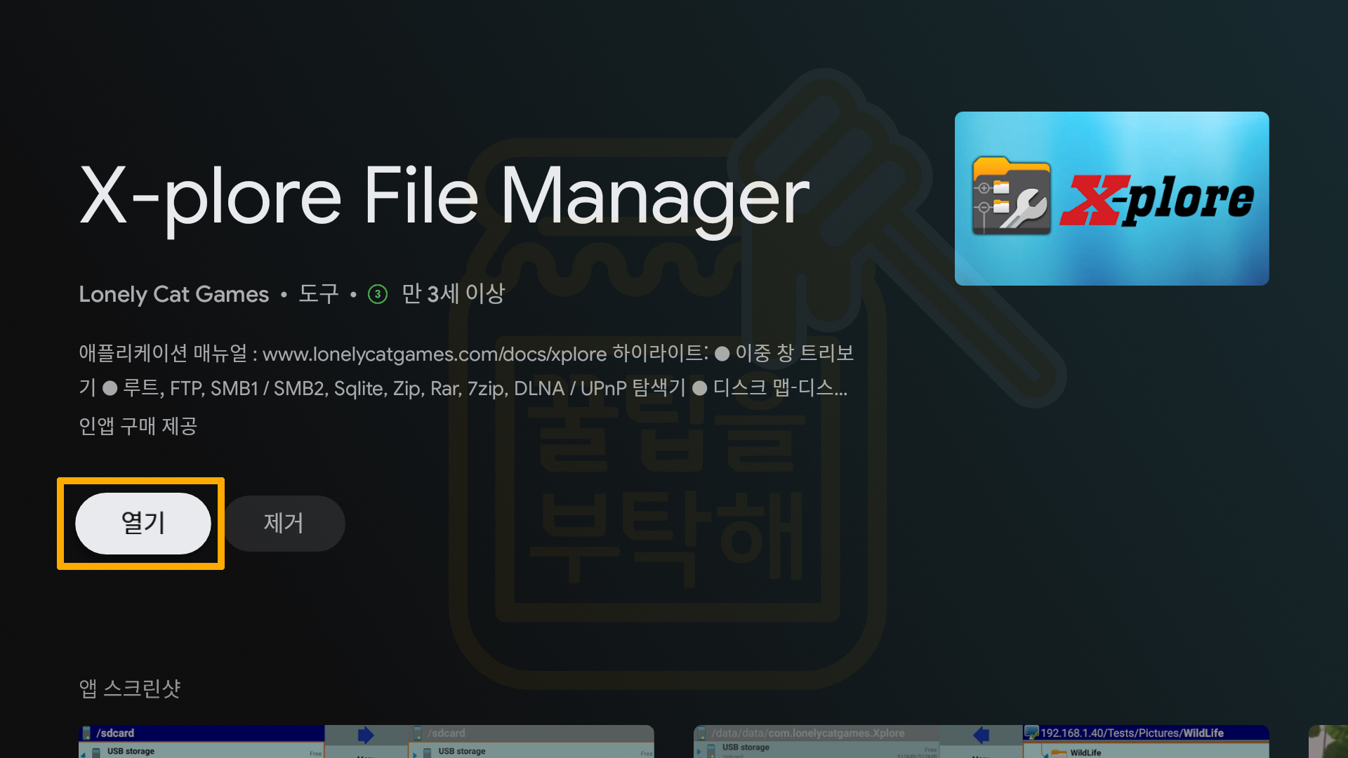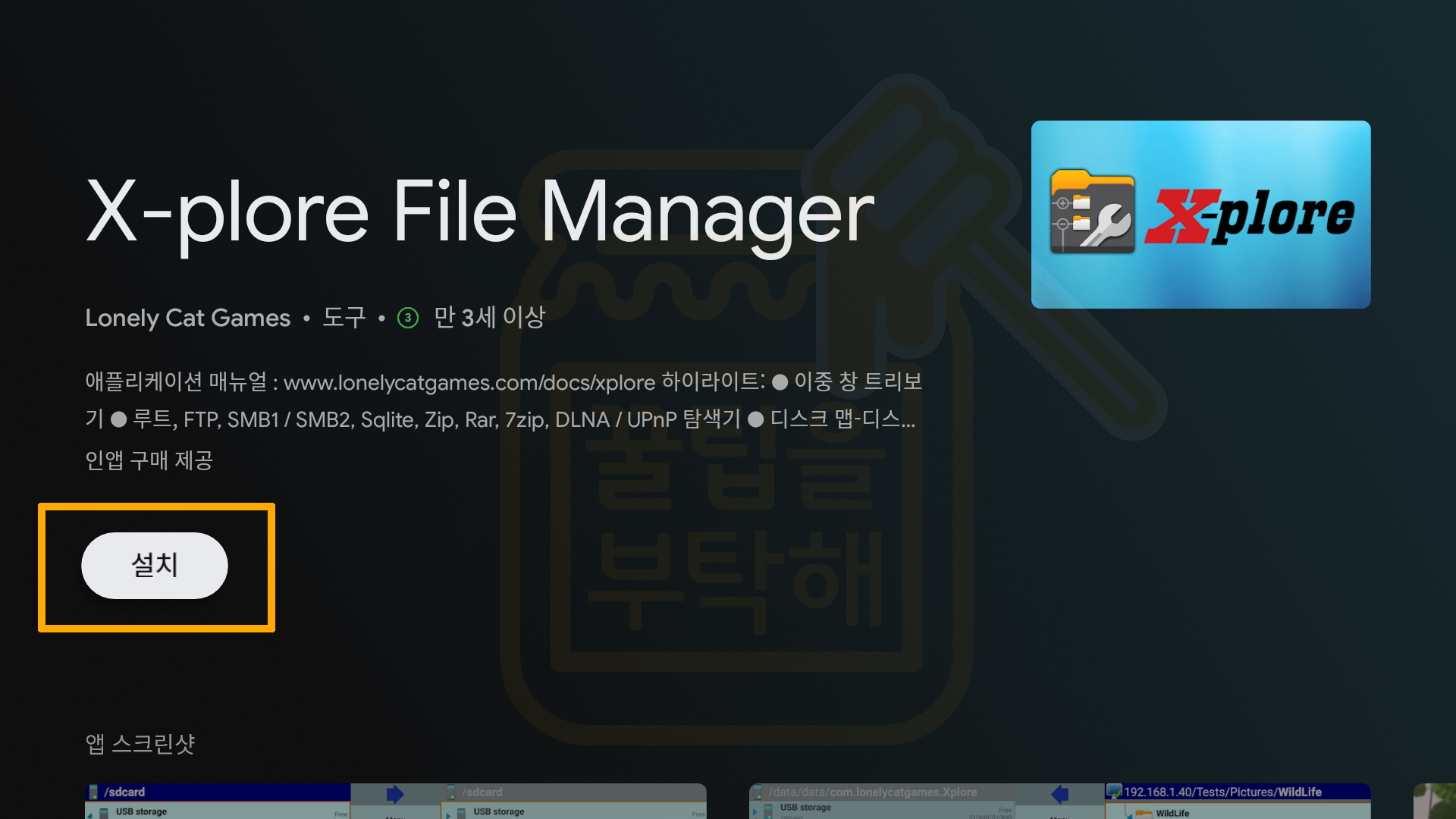 안드로이드TV 기기에 사이드로드로 앱을 설치하려면 '파일 브라우저' 앱을 먼저 설치해야 한다. 구글 Play Store에 다양한 앱이 있는데, 그 중 나름 사용성이 괜찮은 'X-Plore'를 이용했다.