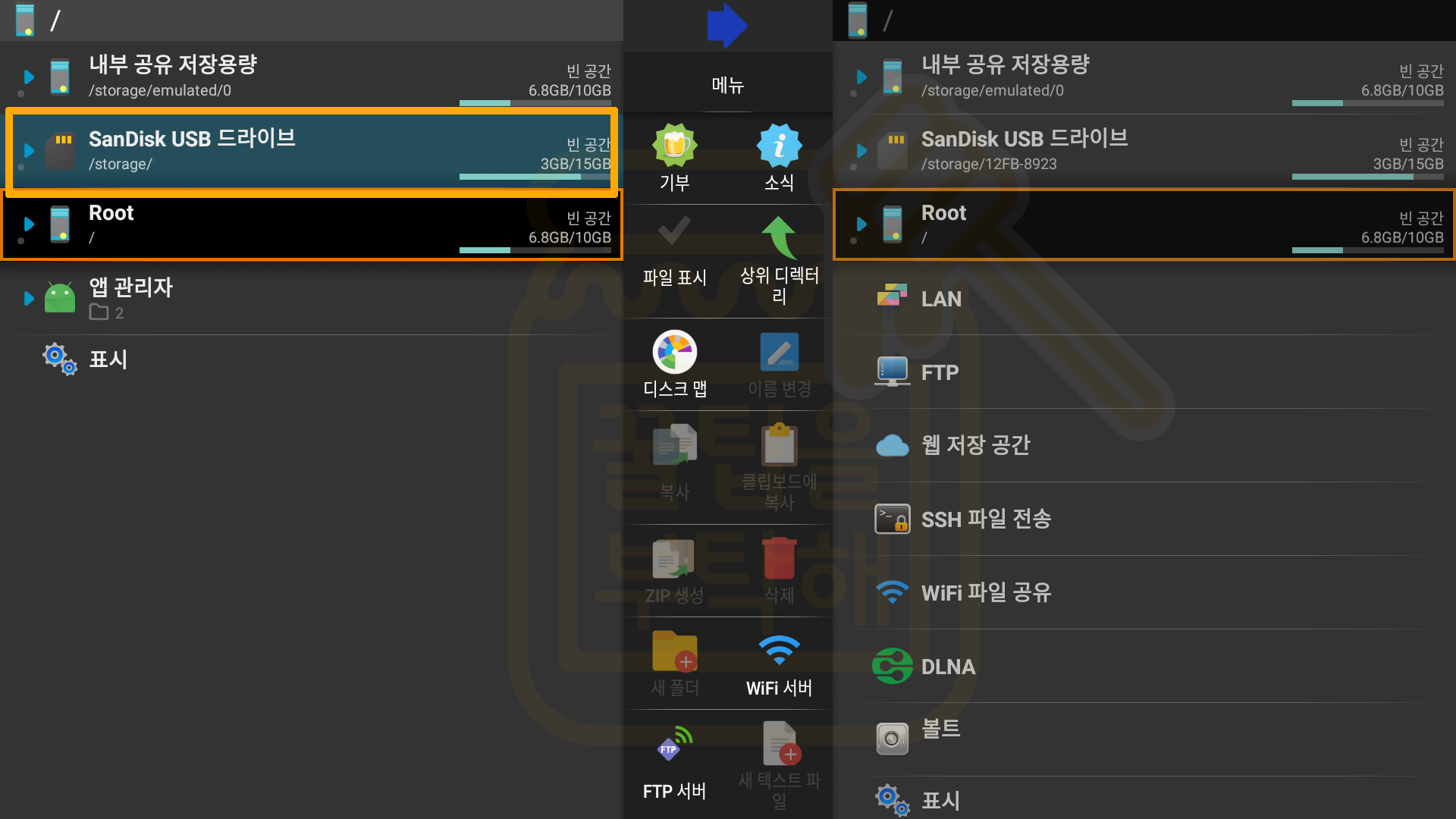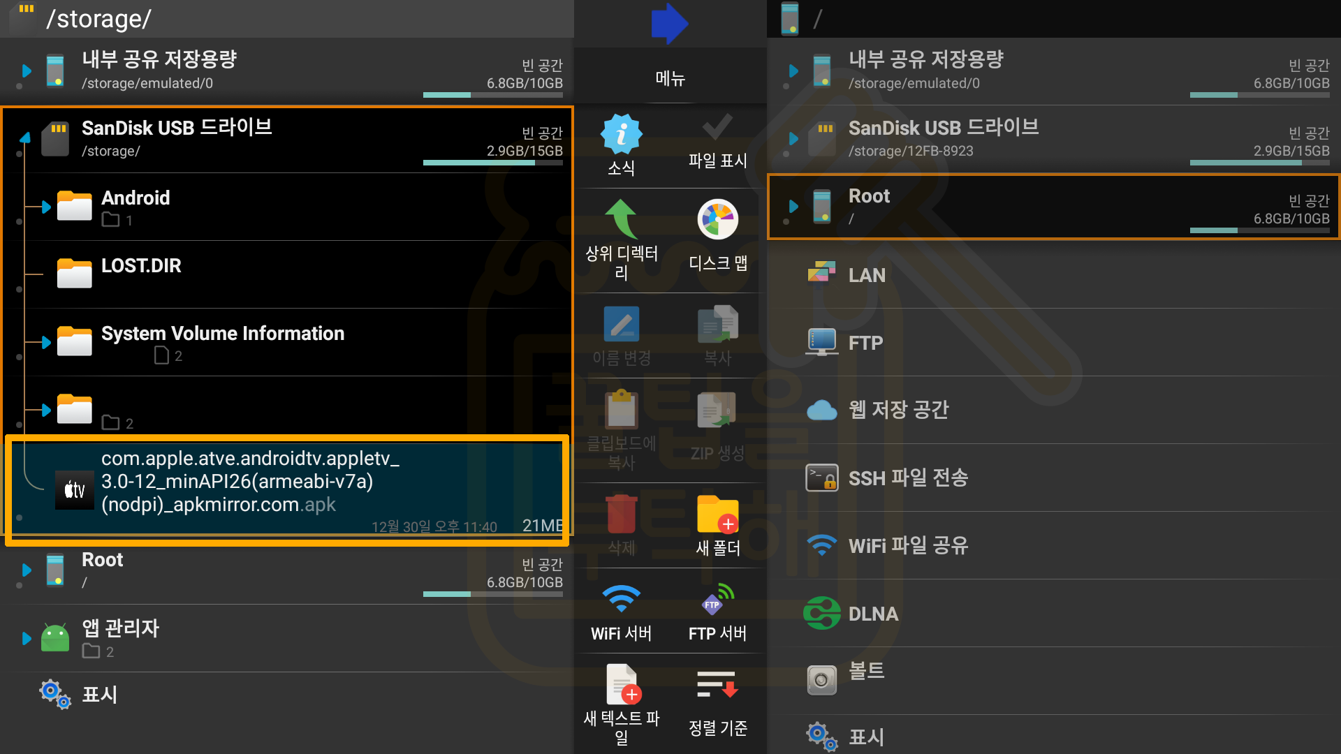 1) X-plore 앱이 실행되면 '애플TV' 앱 APK 파일이 들어있는 외장장치(USB)로 이동한다. (아래 이미지에서는 'SanDisk USB 드라이브'로 표시됨)