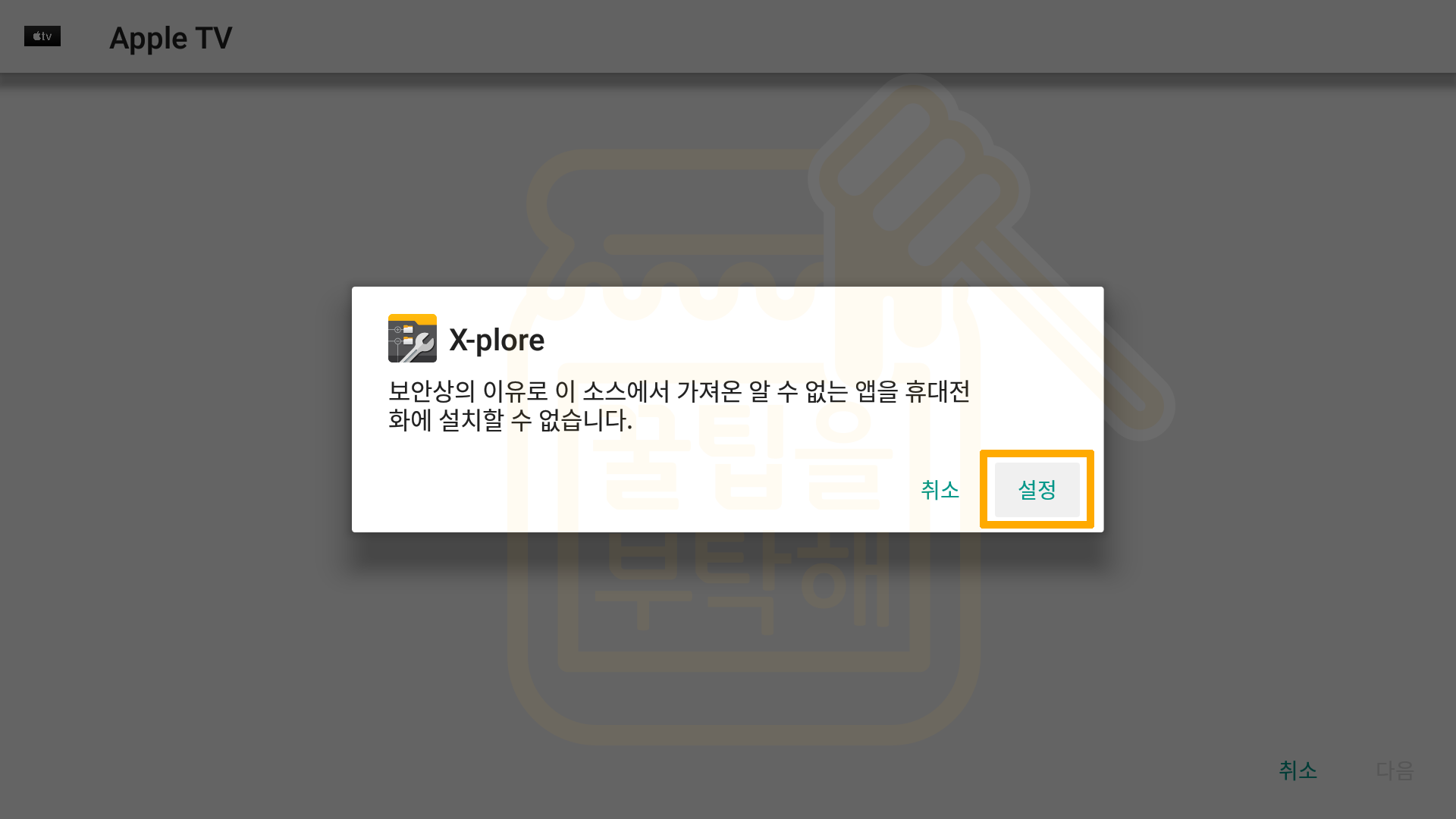 3) APK 파일을 실행하면 '보안상의 이유로 ..'라는 안내 메시지가 나온다. 파일탐색기 앱에서 APK 파일을 처음 실행하면 최초 1회 나오는 메시지로 [설정]을 눌러 이동한다.