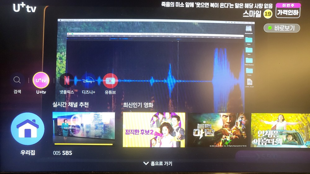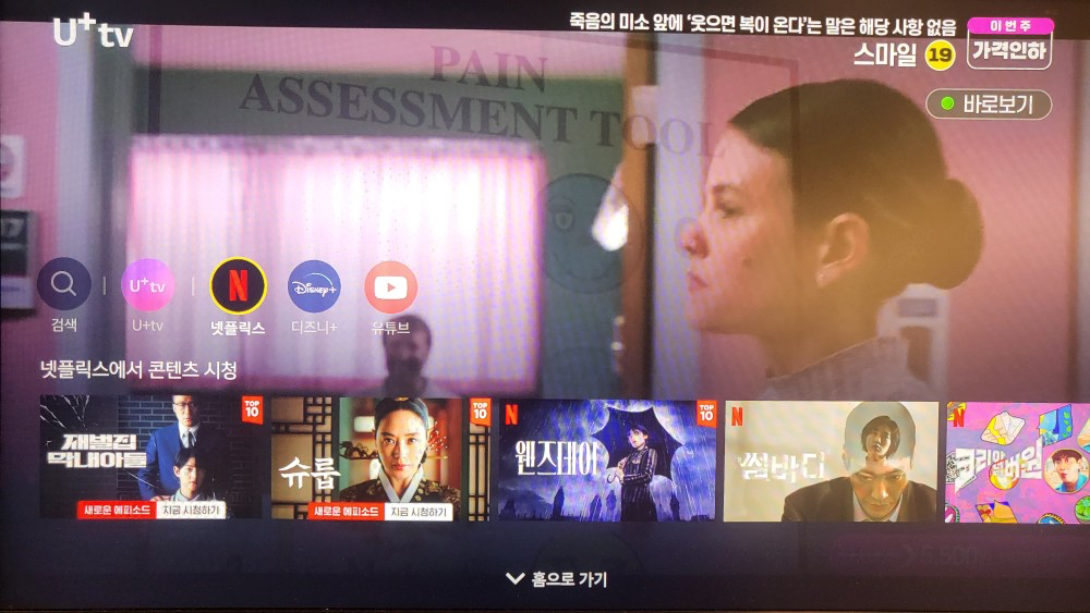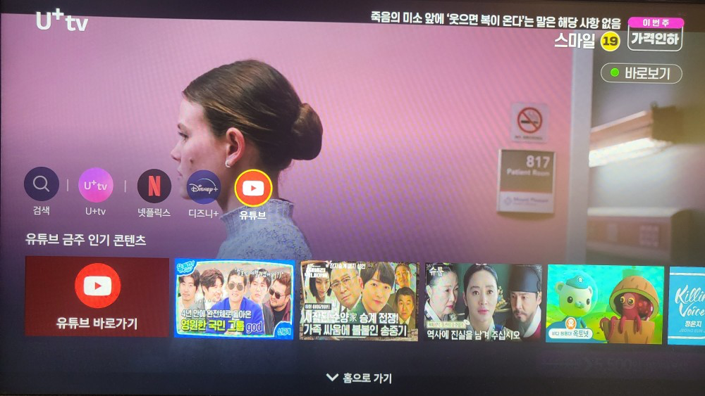 U+tv를 켜면 "첫 화면"에서부터 "OTT TV"의 기능 중 하나인 "추천홈"을 만나볼 수 있다.