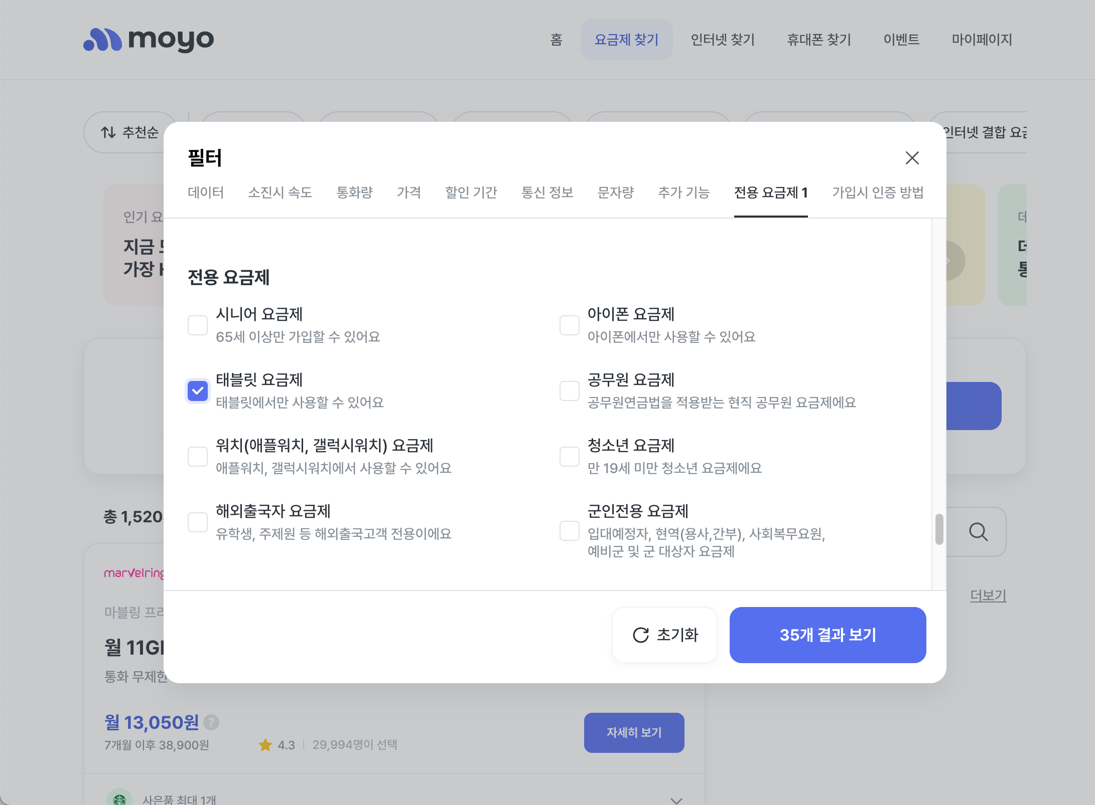 필터에서 "태블릿 요금제"를 선택하면 LTE 라우터에서 쓸 수 있는 요금제만 정리해서 바로 볼 수 있다.