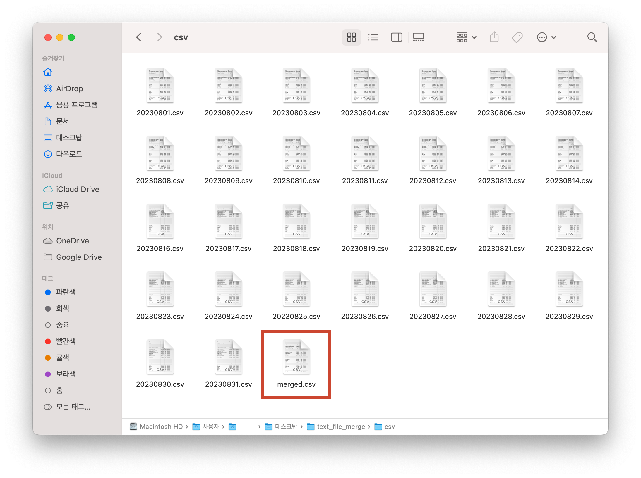 ⚠ 위에서는 'merged.csv'로 만들었기 때문에, 'merged.csv' 파일이 만들어짐